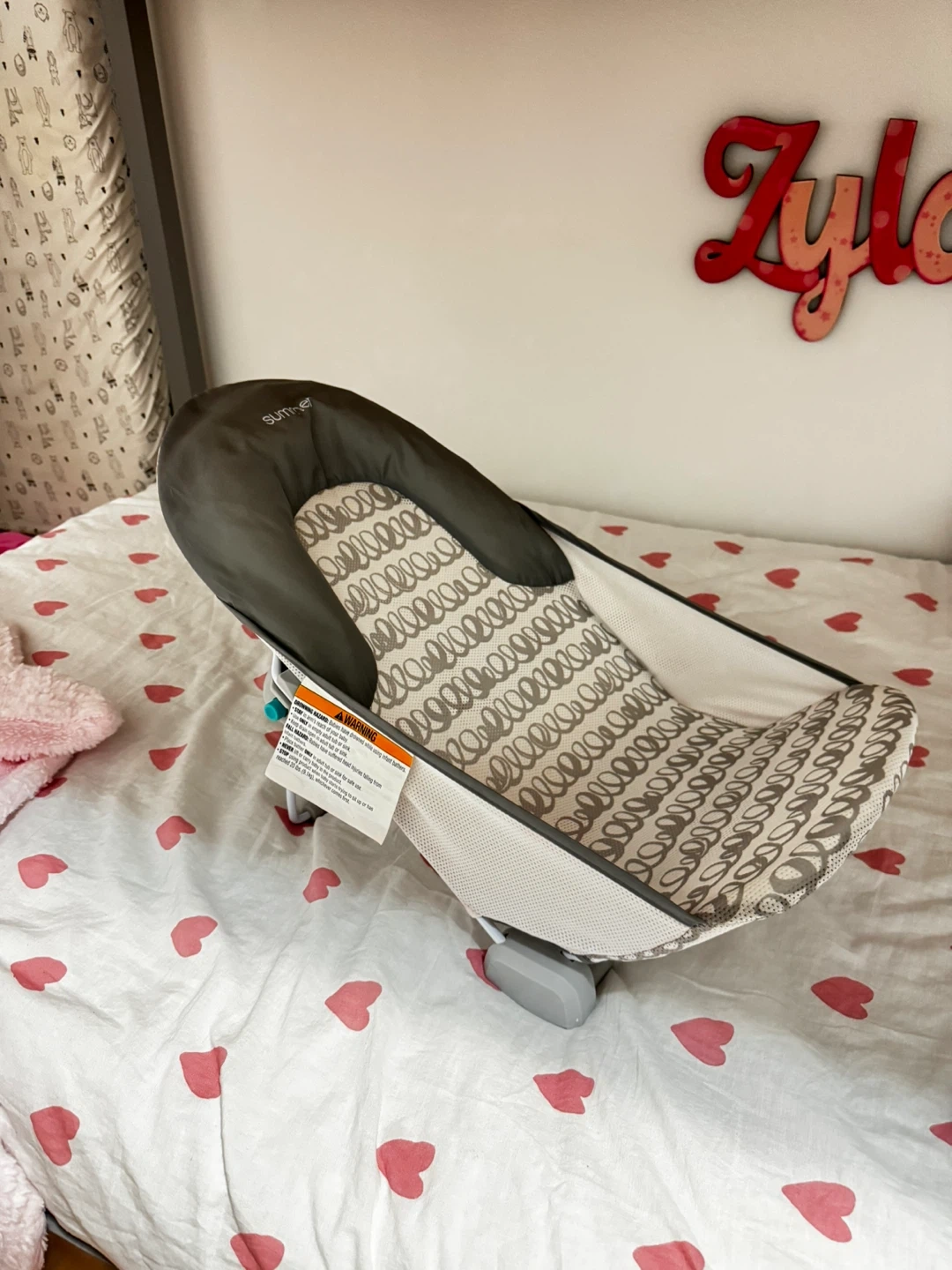 This is a Summer Infant baby bather seat. It has a supportive design with a comfortable fabric insert. The seat's material is a soft fabric with a grey and white swirl pattern.