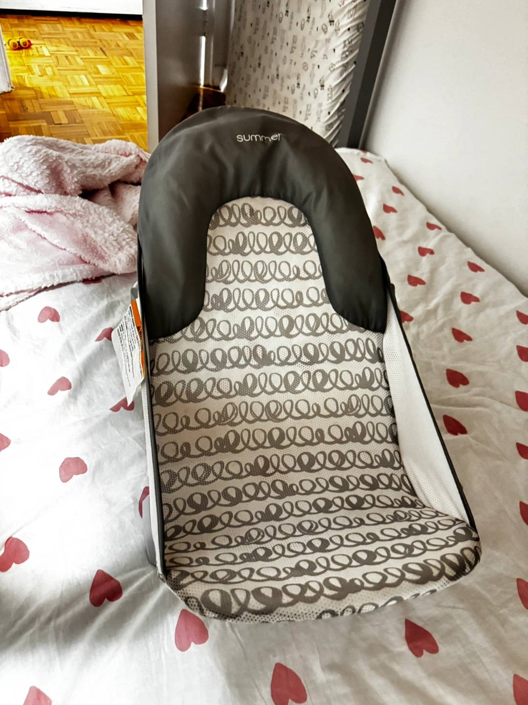 This is a Summer Infant baby bather seat. It has a supportive design with a comfortable fabric insert. The seat's material is a soft fabric with a grey and white swirl pattern.