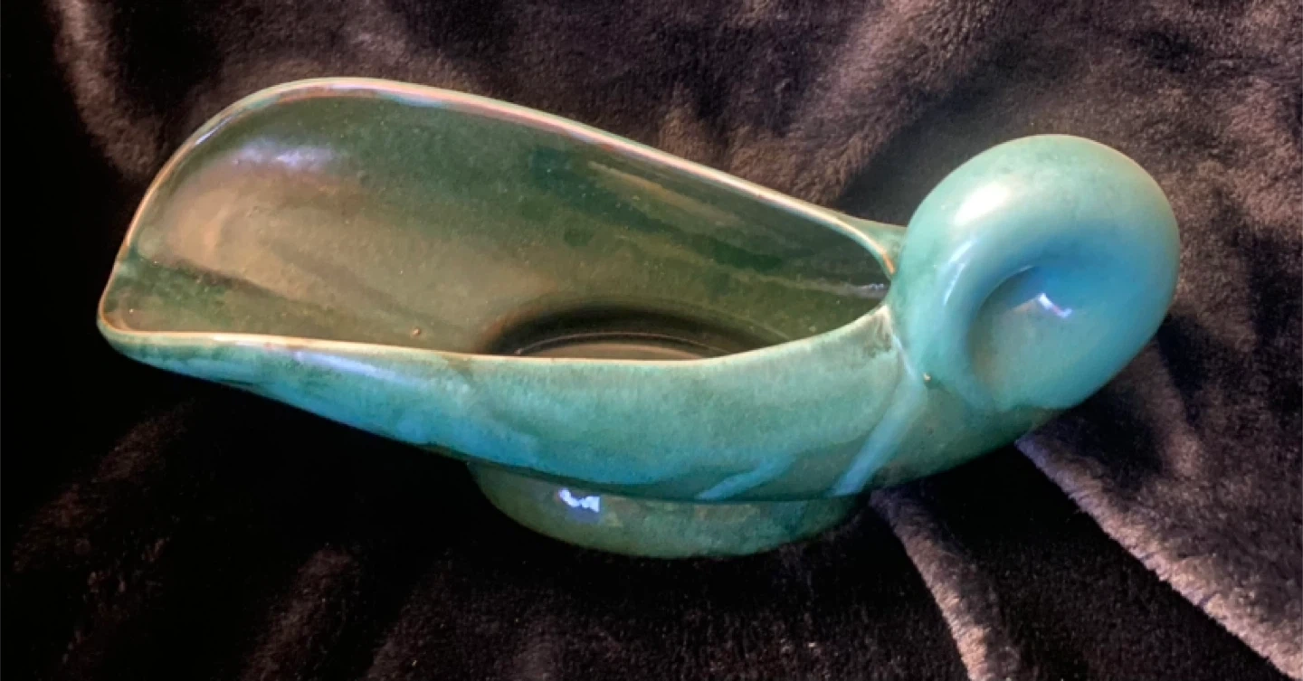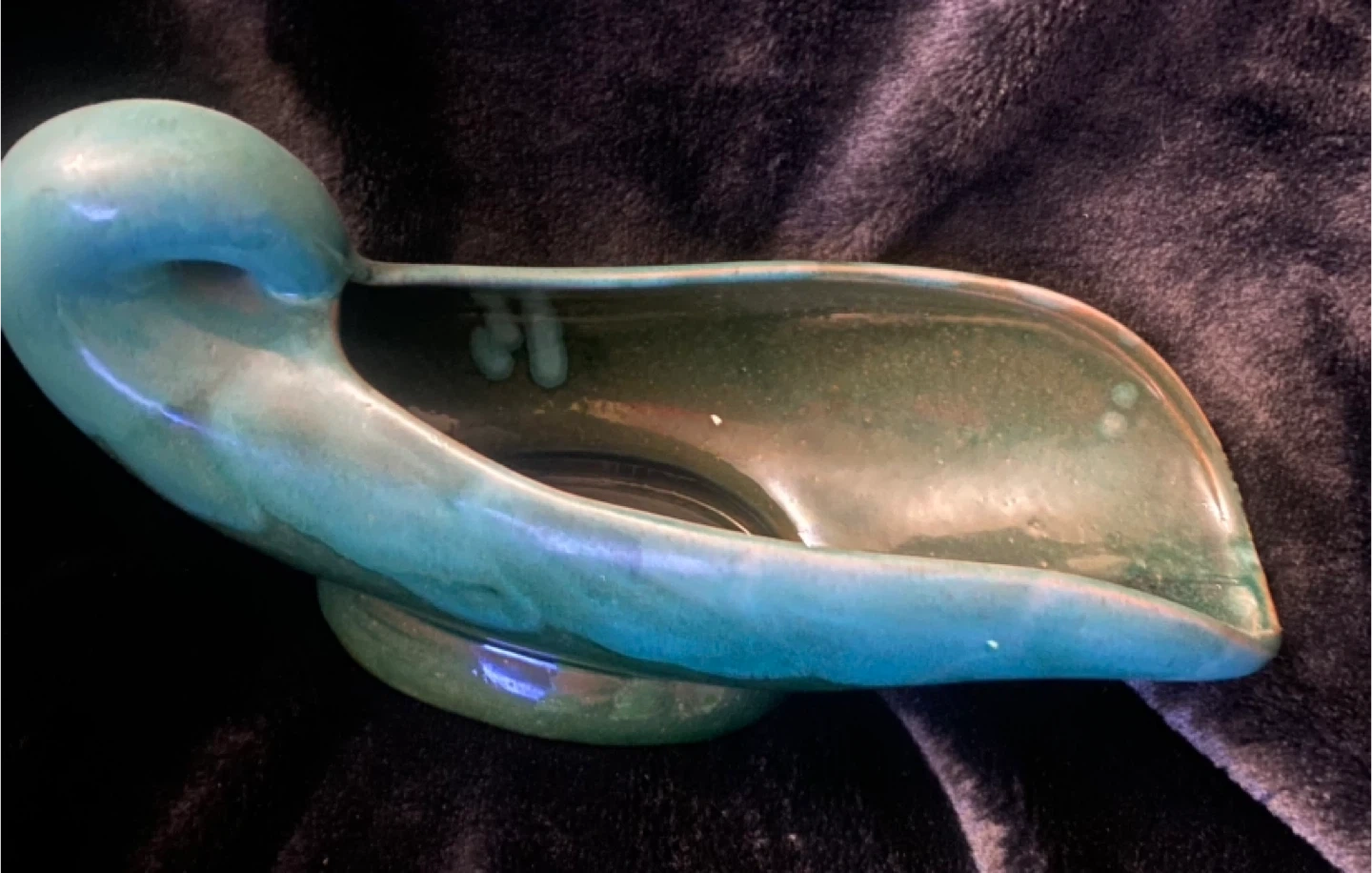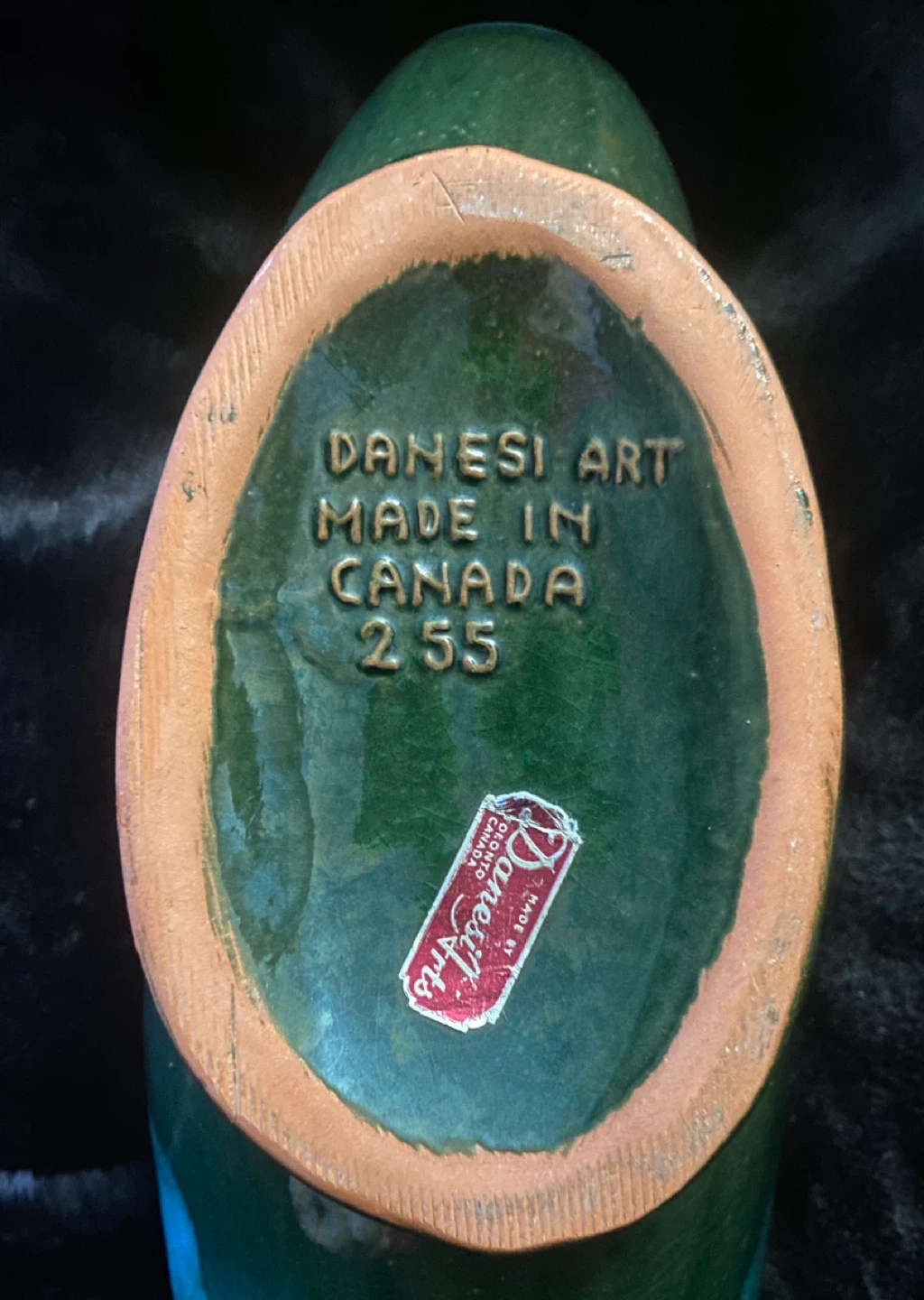 This is a beautiful green ceramic pitcher vase made by Danesi Art in Canada. It features a unique, artistic design with a smooth glaze. Its distinctive shape makes it a lovely decorative piece.