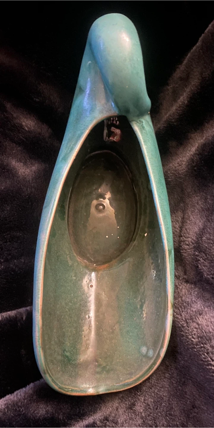 This is a beautiful green ceramic pitcher vase made by Danesi Art in Canada. It features a unique, artistic design with a smooth glaze. Its distinctive shape makes it a lovely decorative piece.