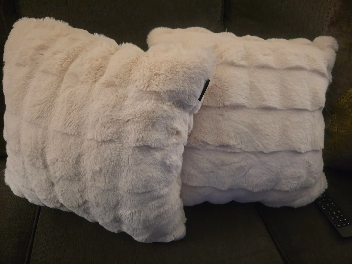 Two cozy cream-coloured throw pillows with a plush faux fur finish. These decorative cushions feature a textured stripe design. Soft and inviting for any couch or armchair!