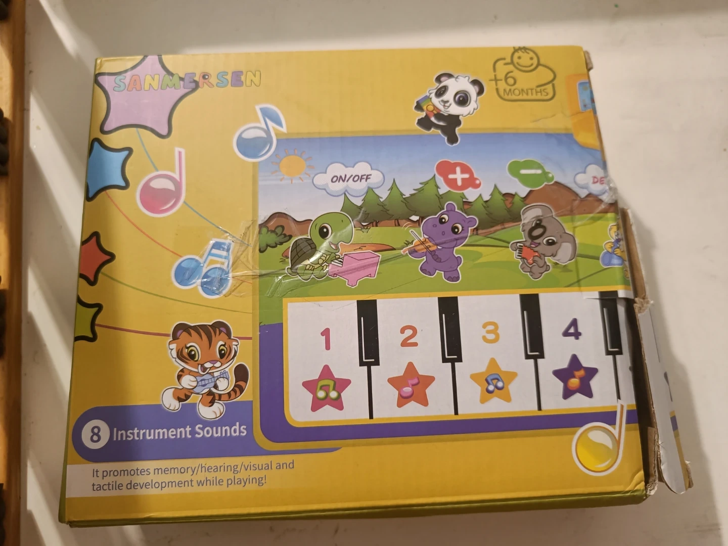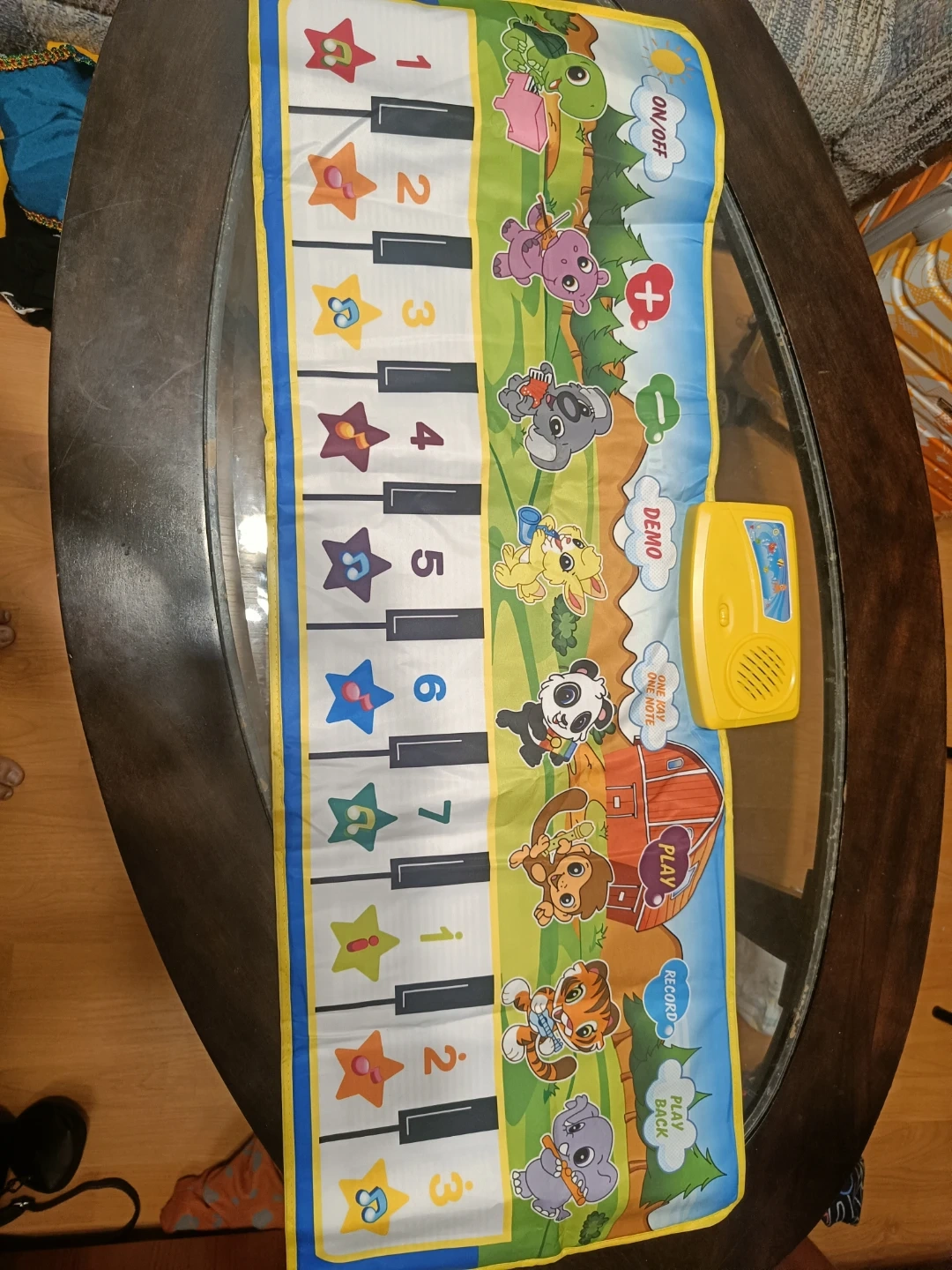 This Sanmersen musical piano play mat has 8 instrument sounds and promotes memory, hearing, visual, and tactile development. It features adjustable volume and an on/off switch. Great for little ones learning to play!
