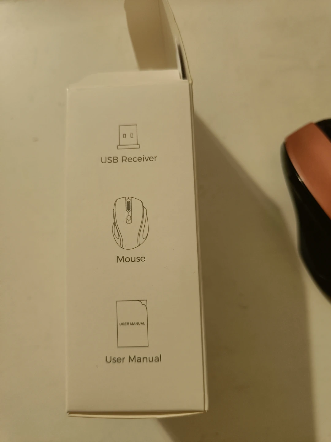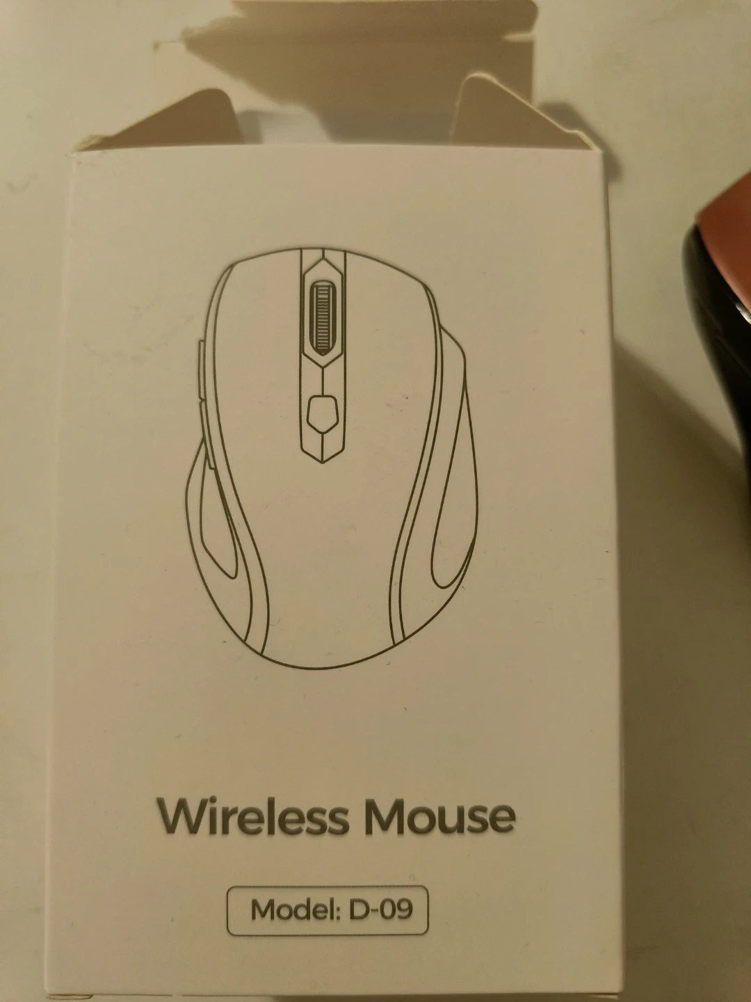 This is a wireless mouse with model number D-09. It includes a USB receiver and user manual. The mouse has a CPI button for sensitivity adjustment.