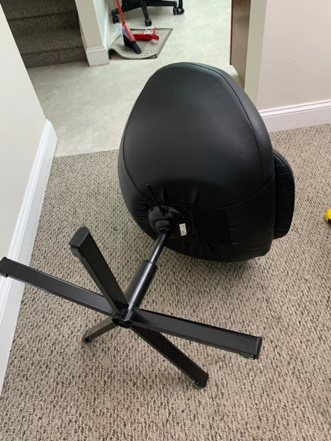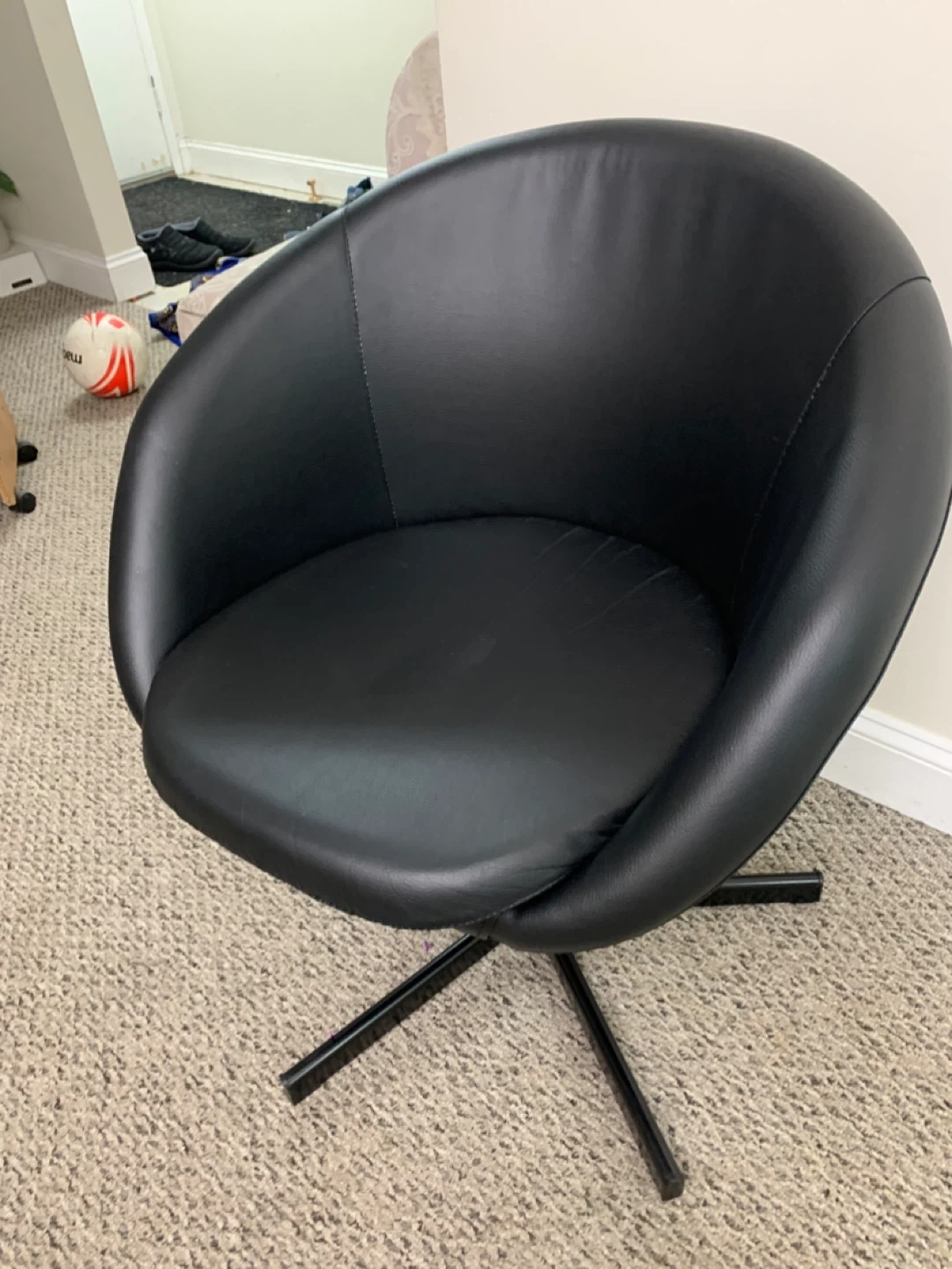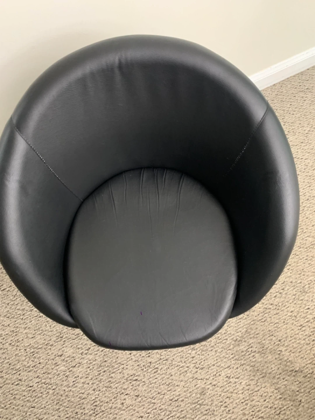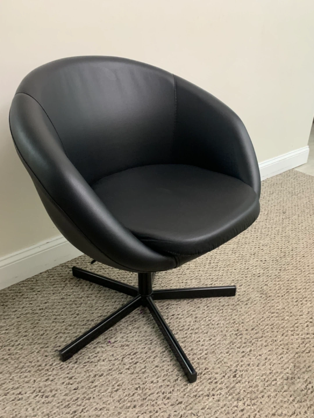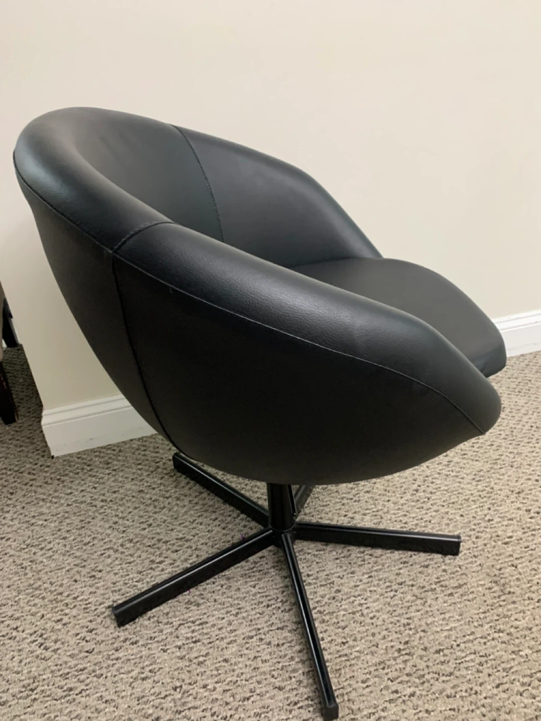 Stylish black accent chair with a modern swivel base. It's upholstered in faux leather and offers a comfortable seating experience. This chair is a nice addition to any living room or office space.