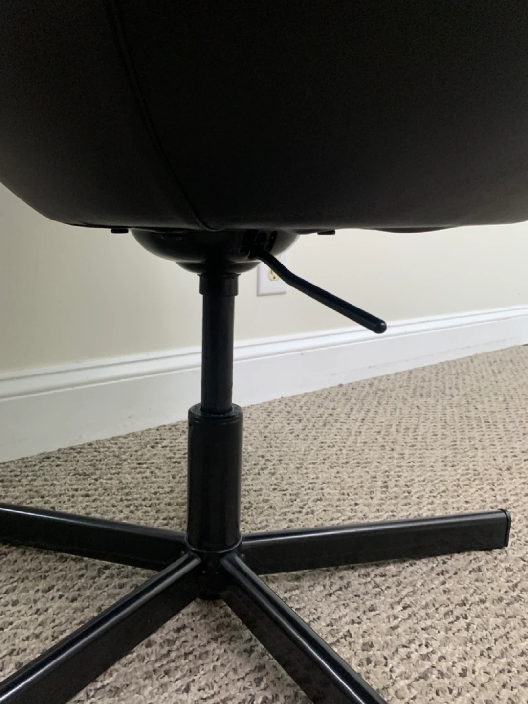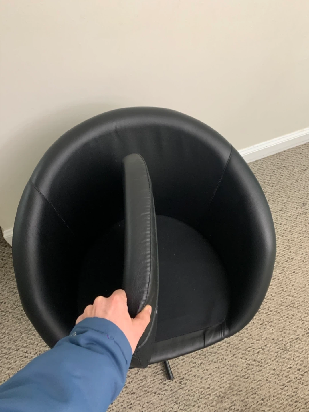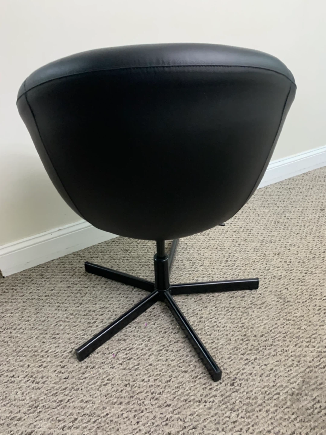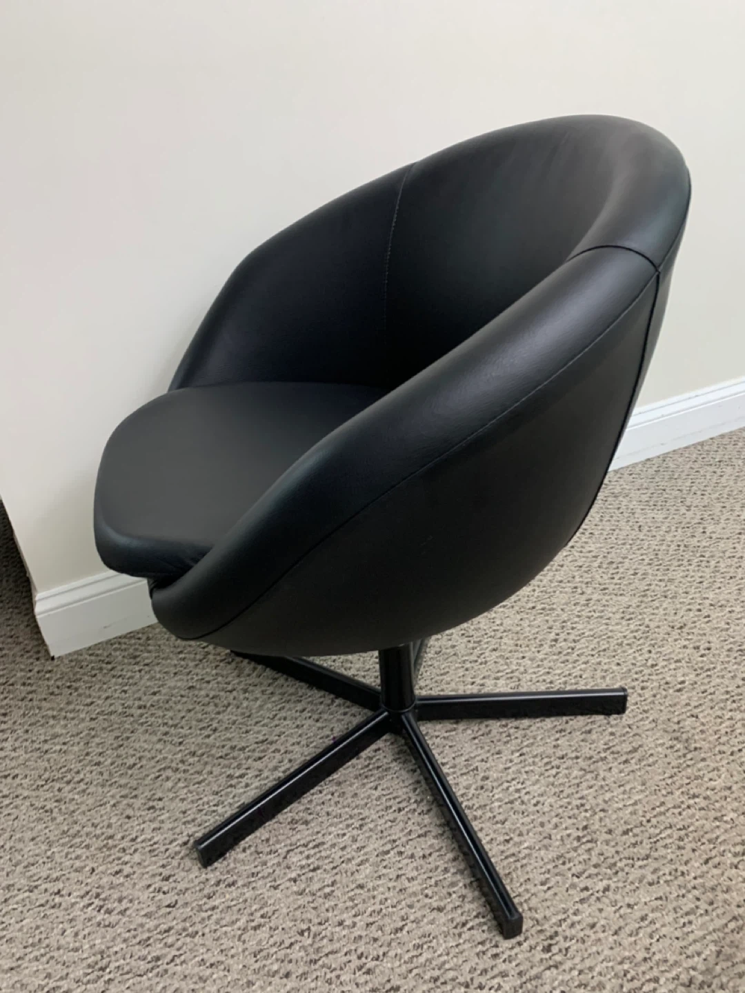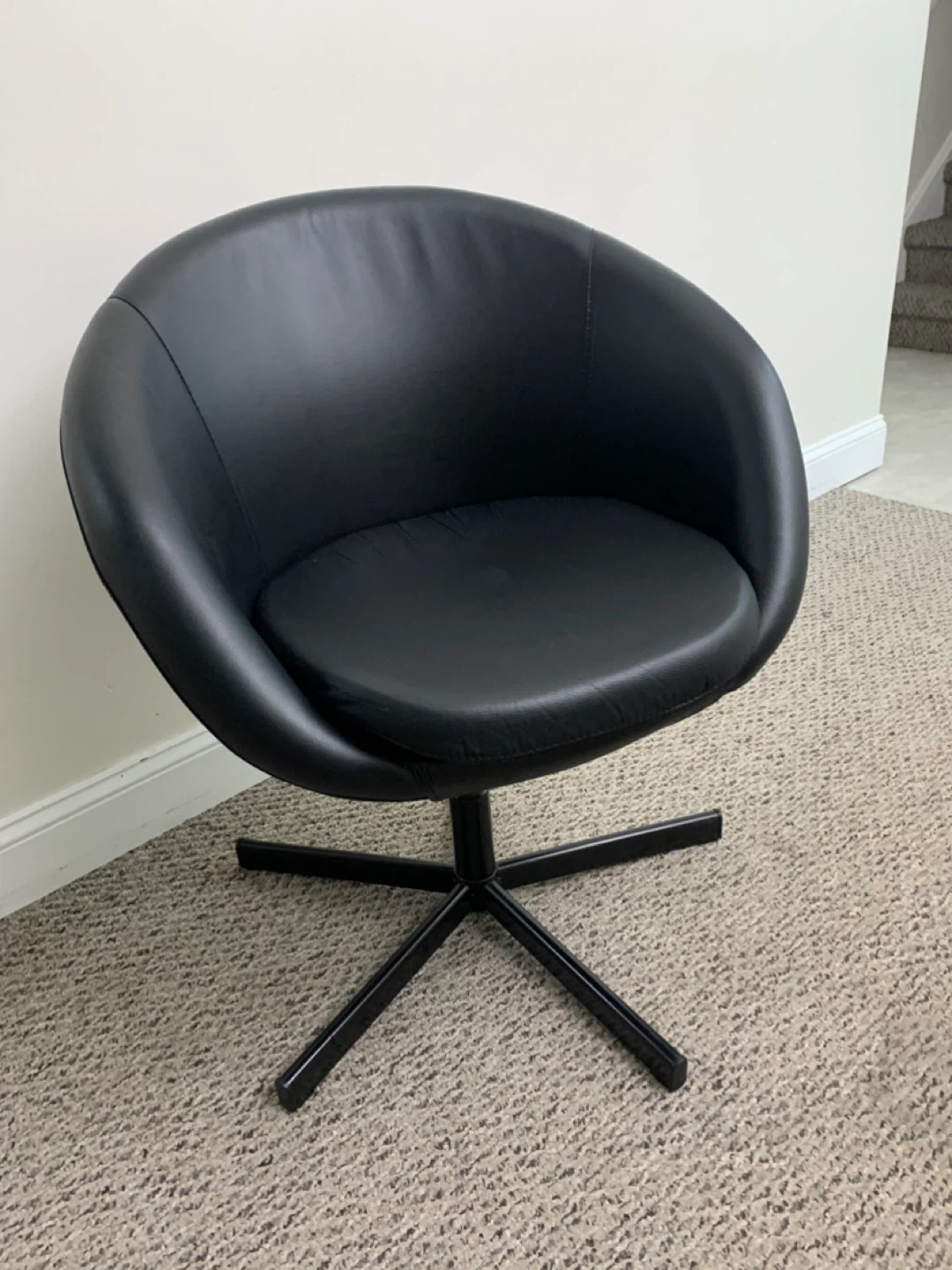 Stylish black accent chair with a modern swivel base. It's upholstered in faux leather and offers a comfortable seating experience. This chair is a nice addition to any living room or office space.