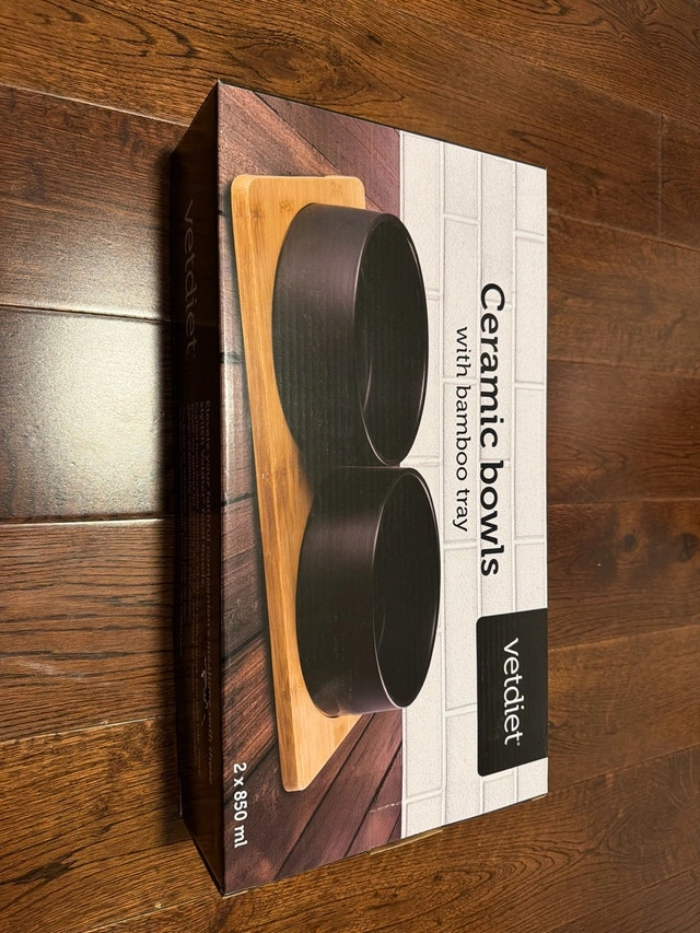 Brand new set of Vetdiet ceramic bowls with a bamboo tray, perfect for your pet's feeding needs. These bowls are stylish, durable, and designed to elevate your pet's mealtime experience. Brand: Vetdiet. Material: Ceramic bowls with bamboo tray. Capacity: 2 x 850 mL. Condition: New in box. Let me know if you're interested!