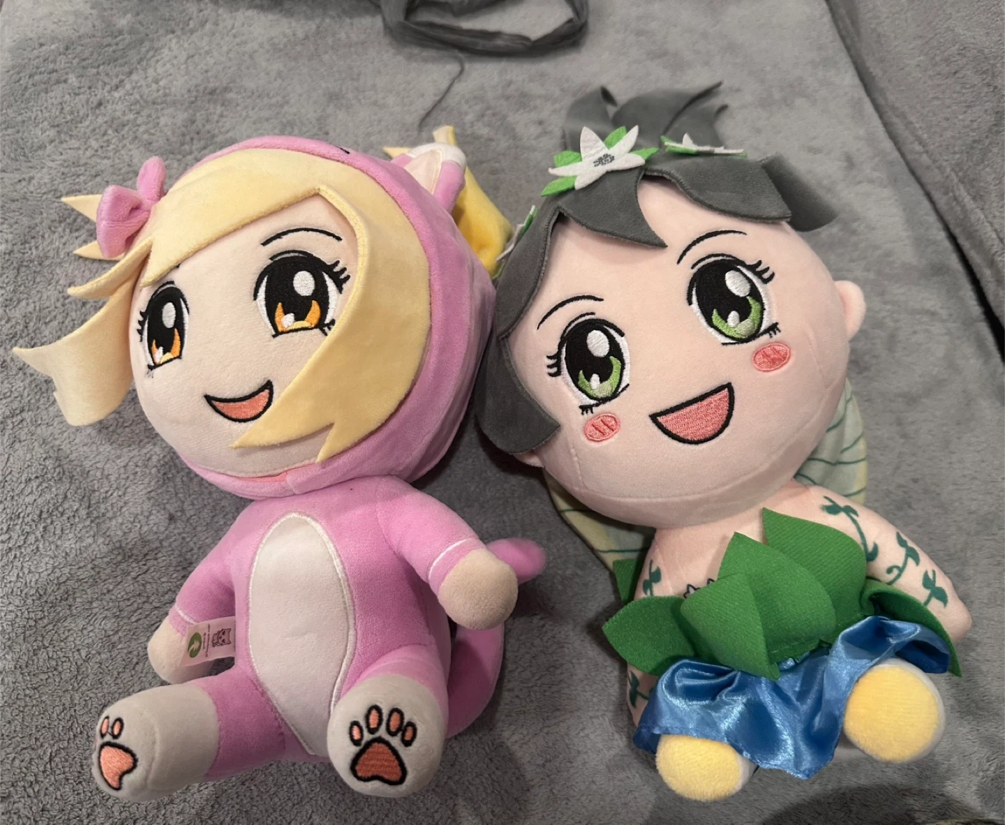Two adorable plush toys, one dressed in a pink cat outfit with ears and a bow, and the other as a fairy with green floral accents. Both have large, expressive eyes and soft, cuddly materials. They're perfect for collectors or as a fun gift! Very clean in good condition smoke and pets free.