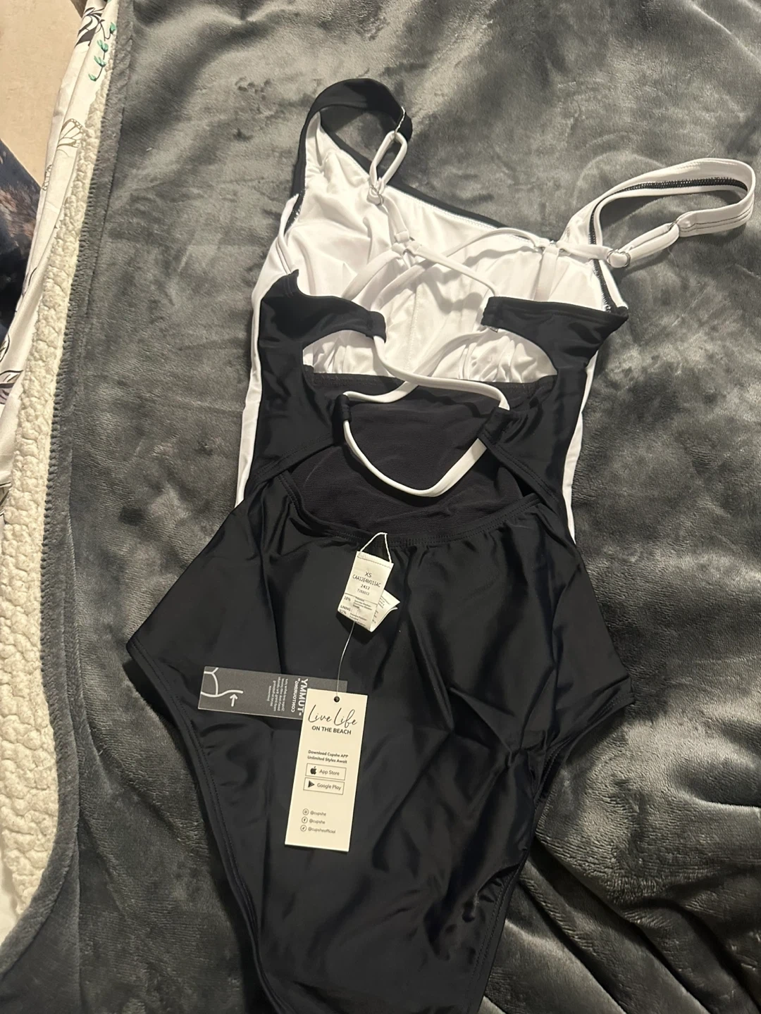 This is a black and white Volcom one-piece swimsuit. It features an asymmetric neckline with a single shoulder strap. Made with a blend of nylon and spandex for comfort and stretch.