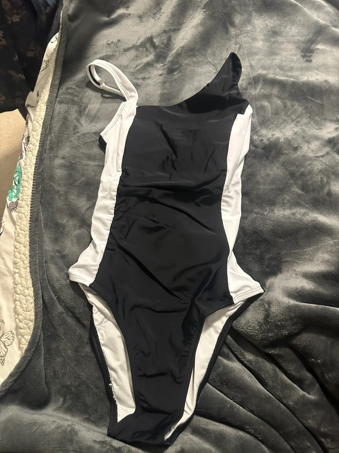 This is a black and white Volcom one-piece swimsuit. It features an asymmetric neckline with a single shoulder strap. Made with a blend of nylon and spandex for comfort and stretch.