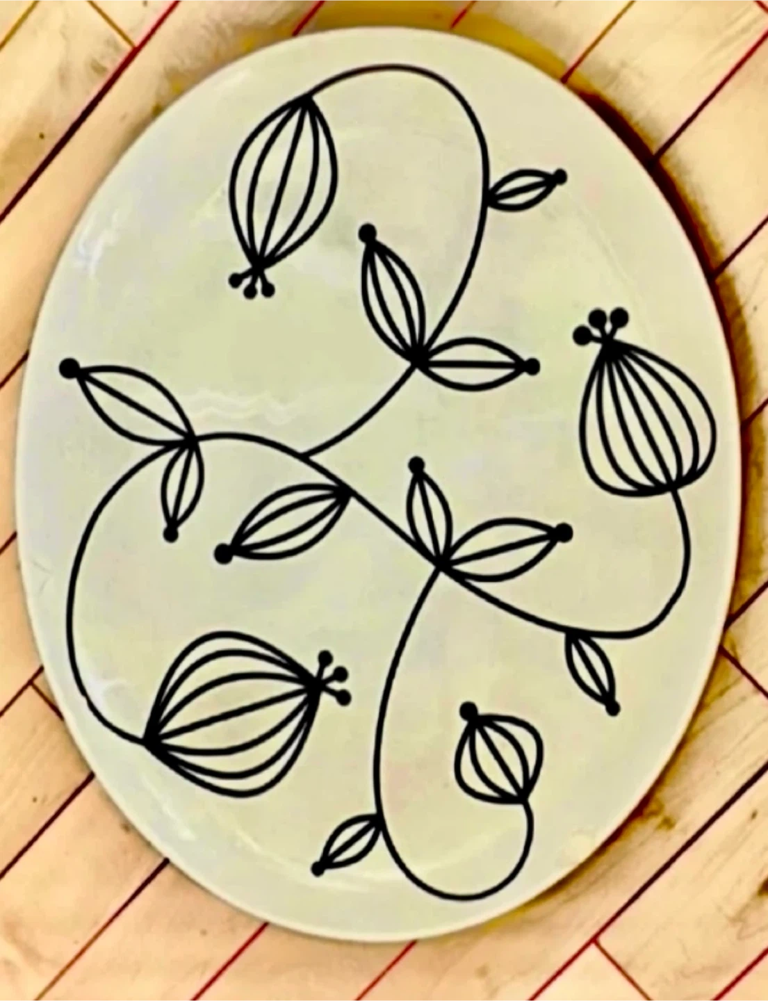 A lovely decorative plate featuring a unique floral design! It would look great on a wall or as a centrepiece on a table. There is little chip on one side