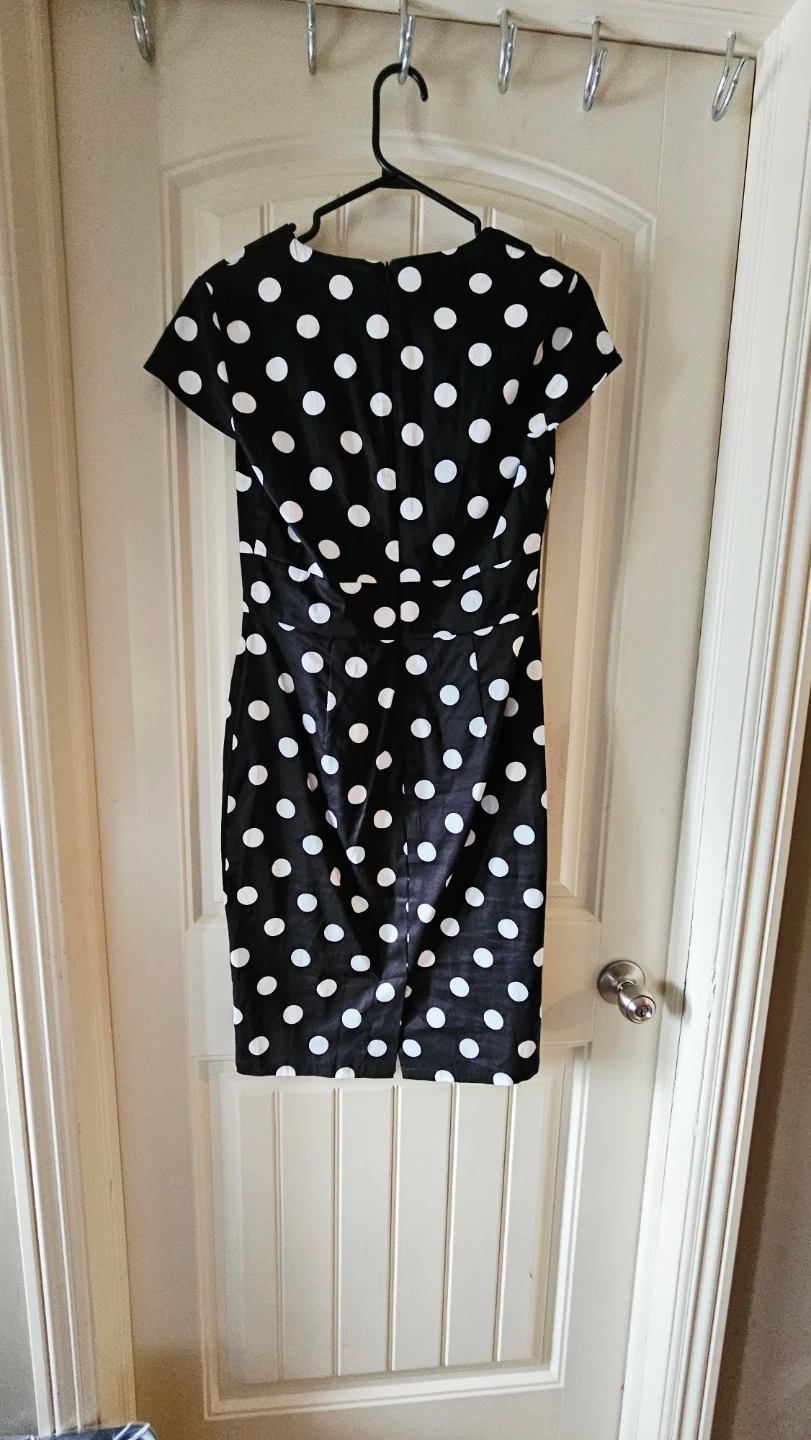 A black and white polka dot dress by Grace Karin. Short sleeves and a satin-like material. It has a flattering silhouette and a small keyhole detail at the neckline. This dress is great for a night out or a special occasion!