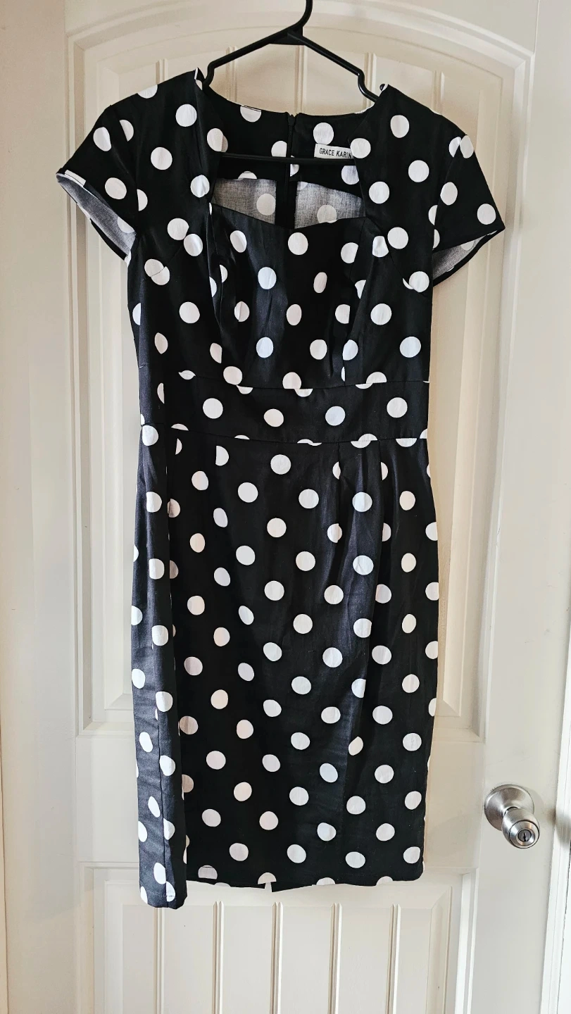A black and white polka dot dress by Grace Karin. Short sleeves and a satin-like material. It has a flattering silhouette and a small keyhole detail at the neckline. This dress is great for a night out or a special occasion!