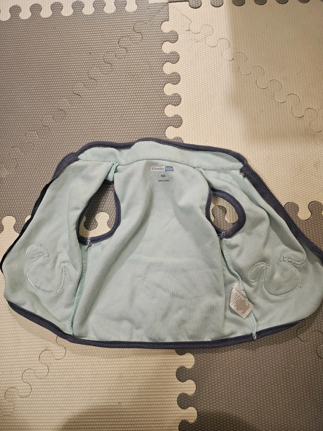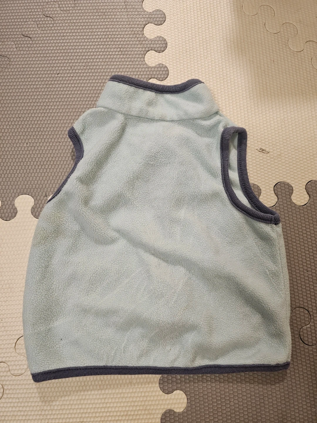 Light blue fleece vest from Vitamins Baby. It features a zipper closure and embroidered dog faces on the front. Size is 9 months.