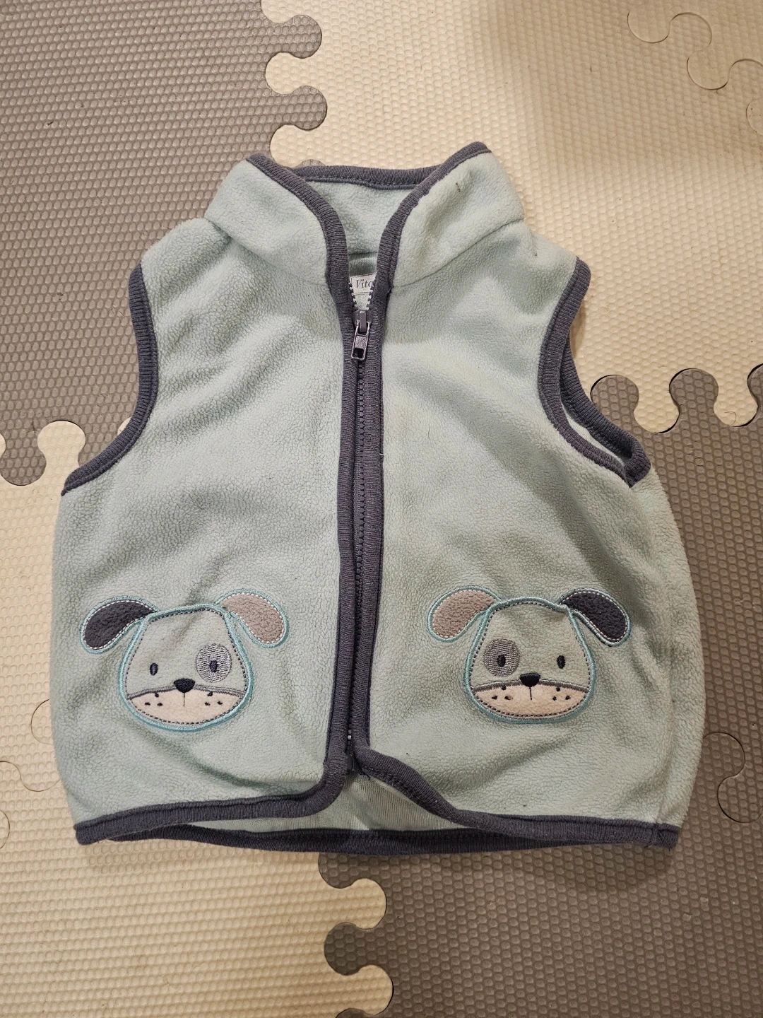 Light blue fleece vest from Vitamins Baby. It features a zipper closure and embroidered dog faces on the front. Size is 9 months.