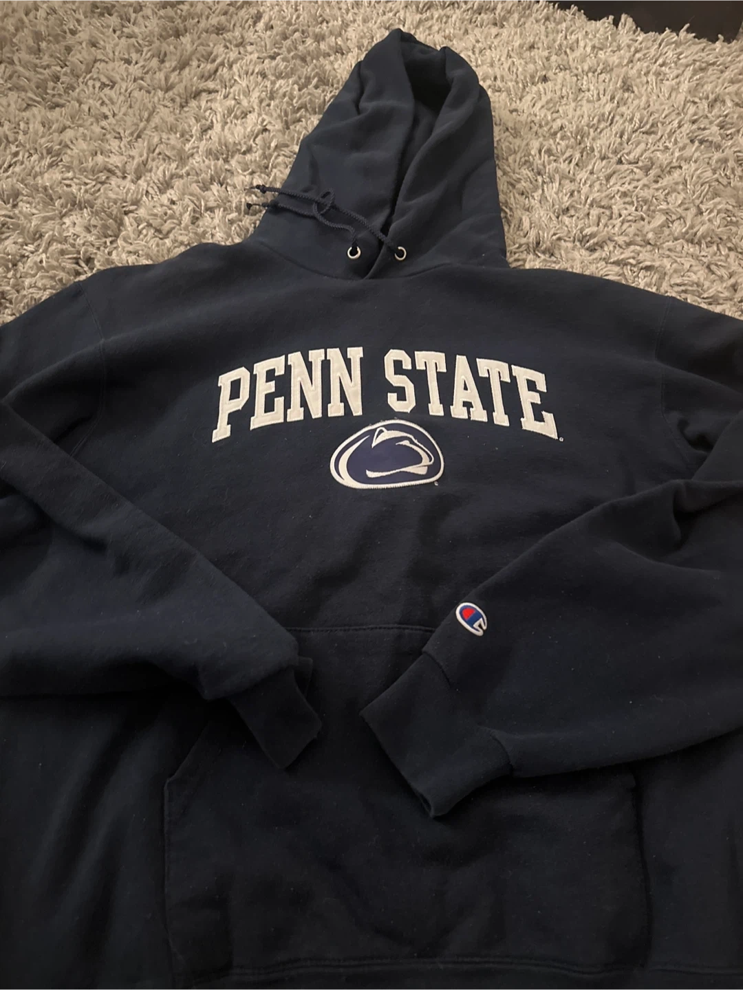 Navy blue hoodie with Penn State graphics. It's made by Champion. This hoodie is great for showing school spirit or for casual wear.