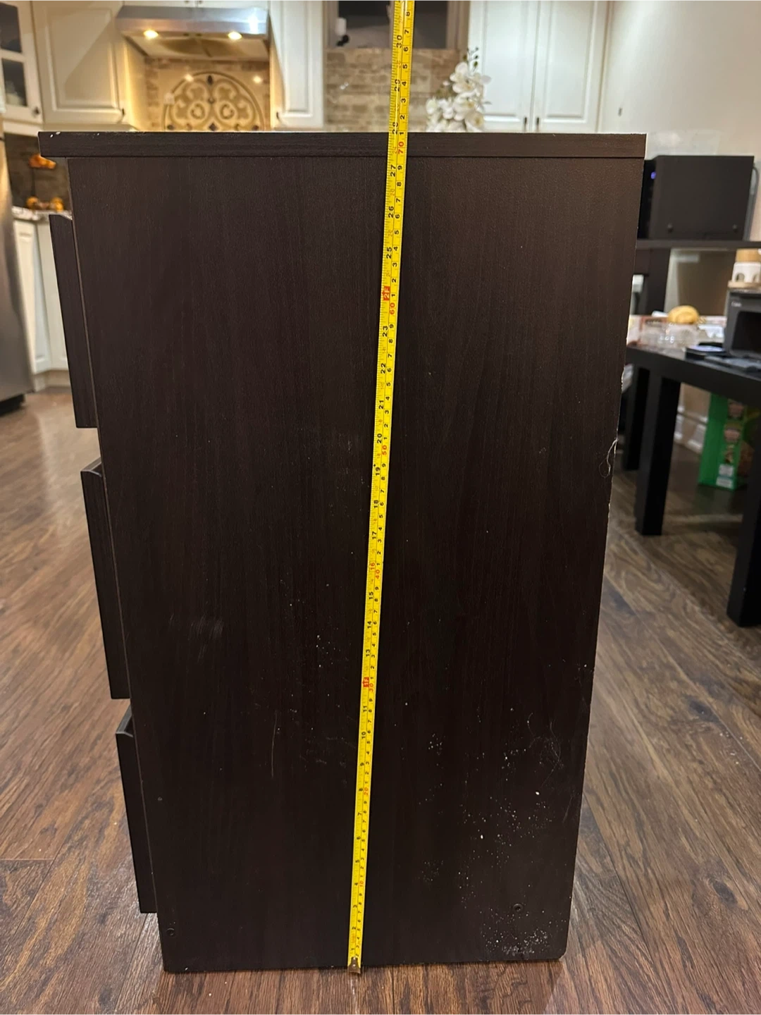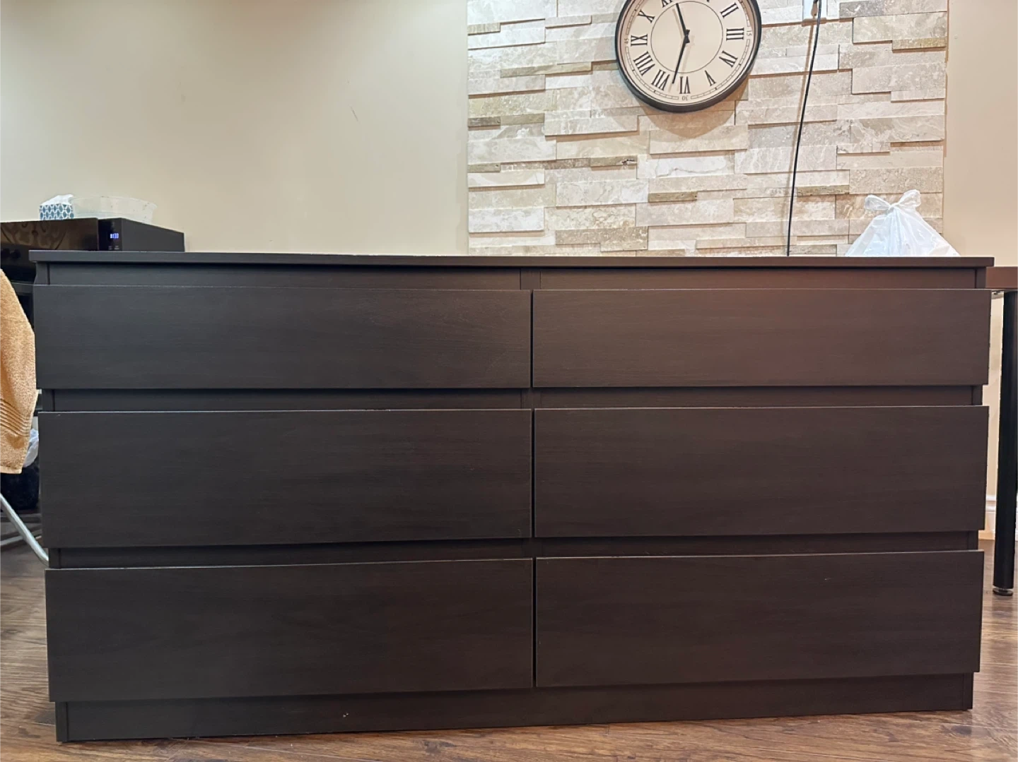 Dark brown 6-drawer dresser from IKEA. Made in Poland. Measures approximately 28" high, 55" wide, and 15.5" deep.