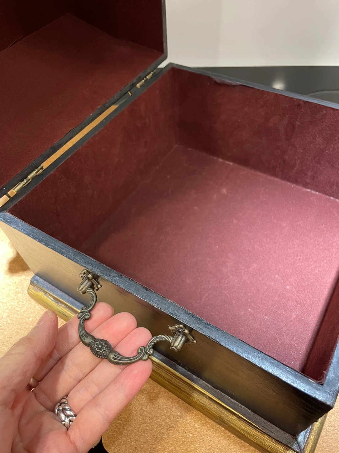 This is a decorative wooden box, featuring a rich dark wood finish with ornate gold-toned metal detailing. It has a hinged lid and a velvet-lined interior, along with a metal handle on the front. This box would be great for storing small treasures or keepsakes!