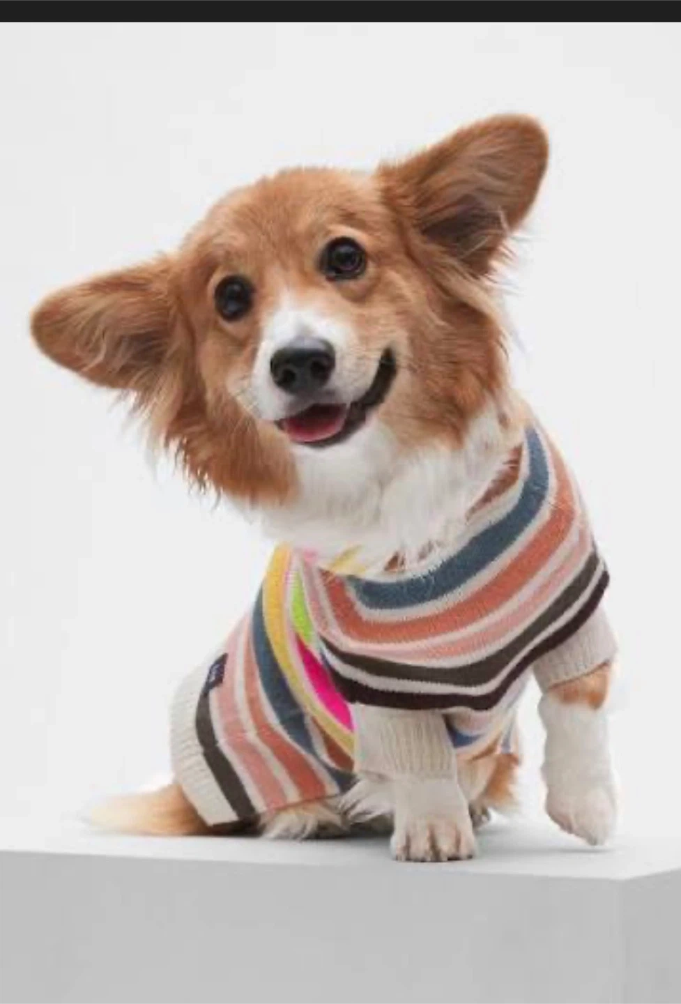 This is a Gap brand striped knit dog sweater. It features a hood and ribbed cuffs for a comfortable fit. It's made of soft material to keep your pet cozy.