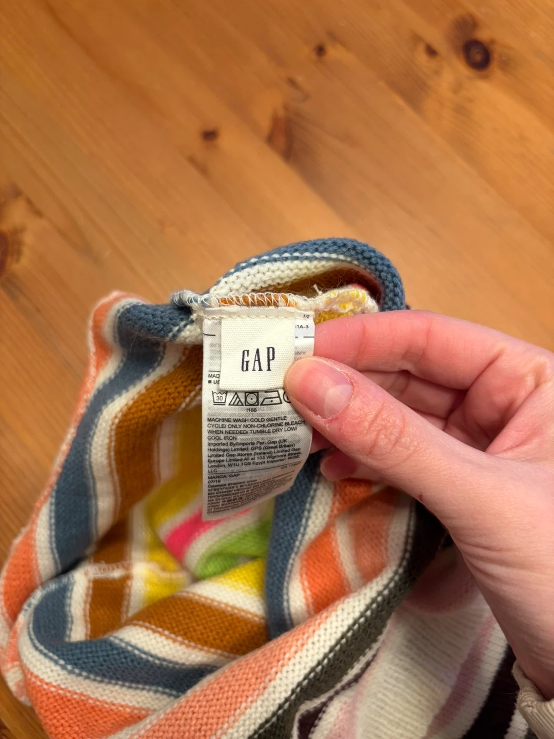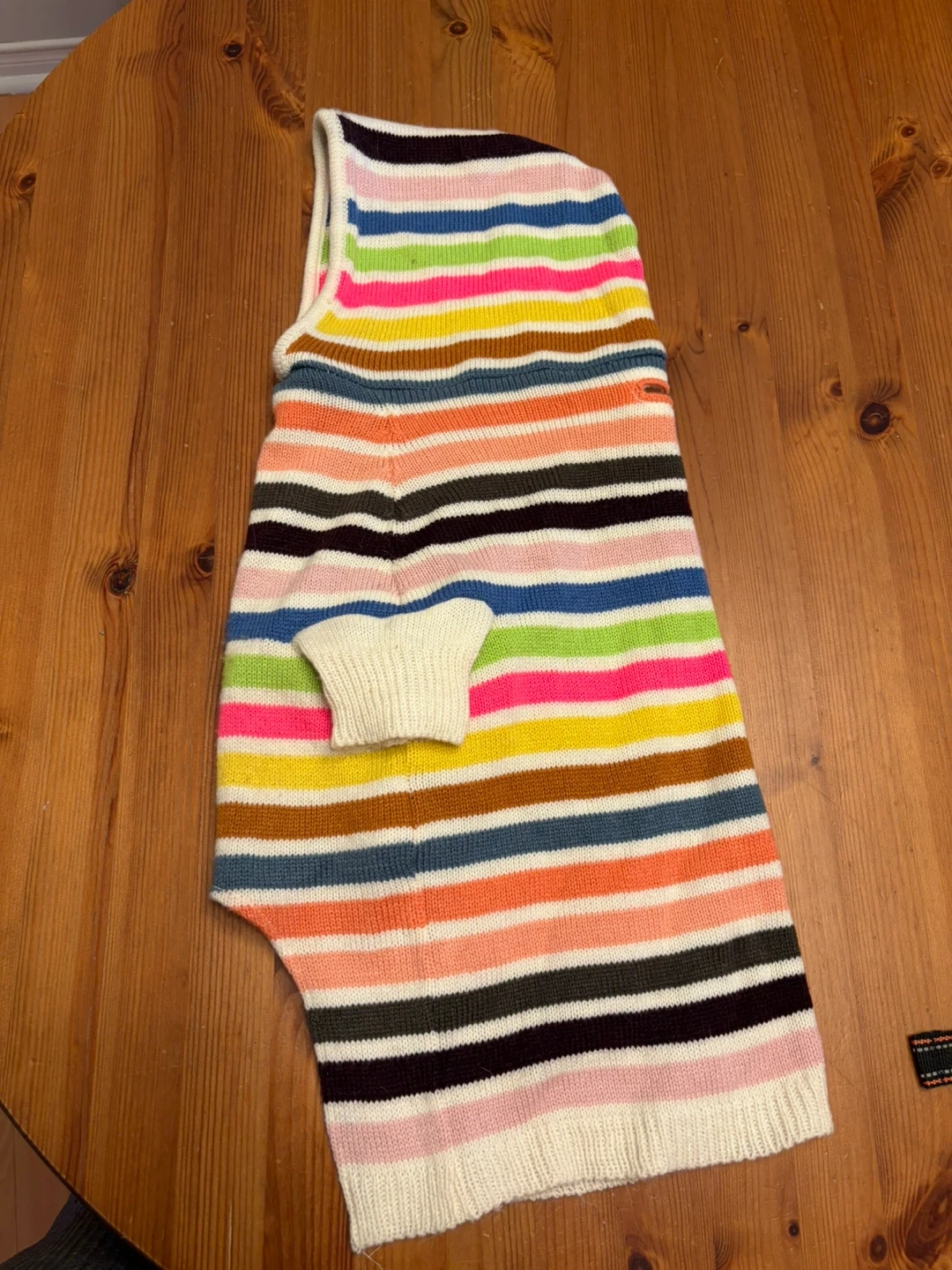 This is a Gap brand striped knit dog sweater. It features a hood and ribbed cuffs for a comfortable fit. It's made of soft material to keep your pet cozy.