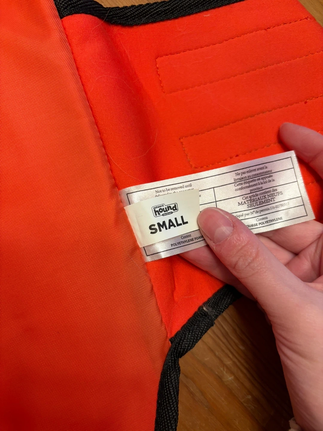 This is an Outward Hound Fun Fish life jacket for dogs. It's a size small. Made with polyethylene foam.