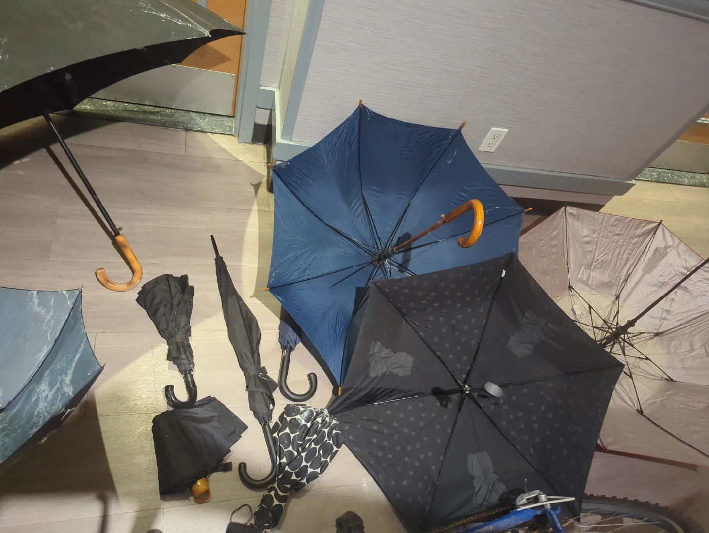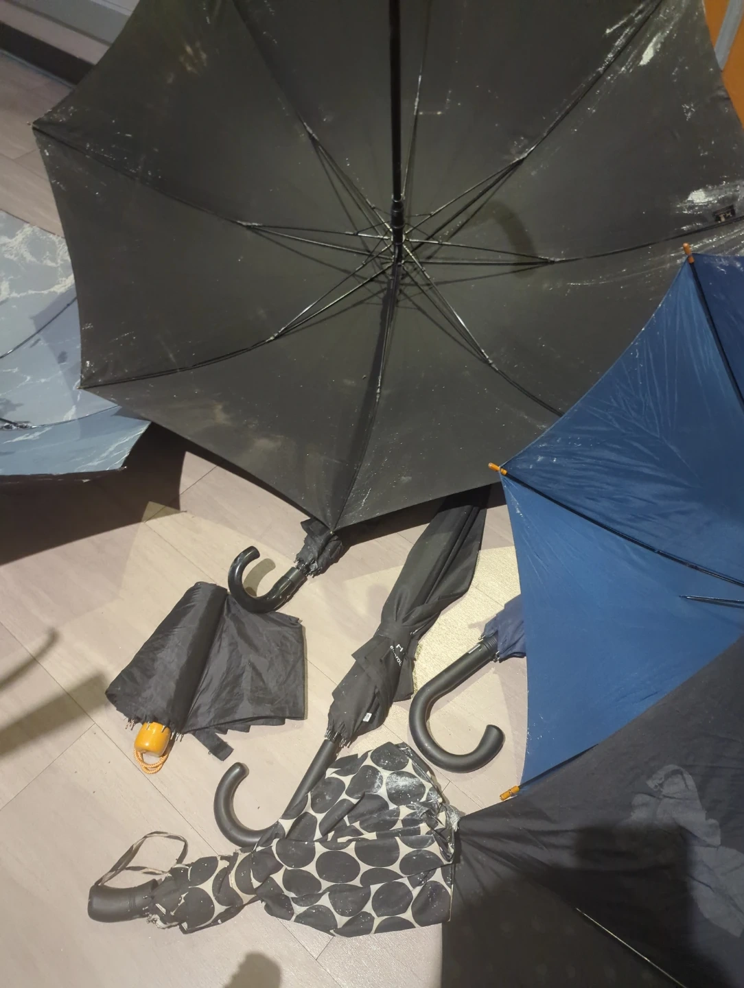 Bundle of umbrellas, including black, blue, and grey. Some feature patterned designs. They've got curved handles for a comfortable grip. Great for unexpected rainy days! 2 for 1 on certain umbrellas , pickup my pleasant / main st / downtown/ Skytrain , etc or get delivered with organic whole foods π π π π π fruit / bread π, etc