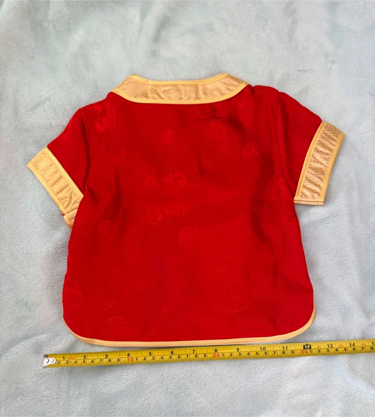 Red short sleeve traditional Chinese top with gold trim and dragon embroidery. Features frog button closures. Size 2.