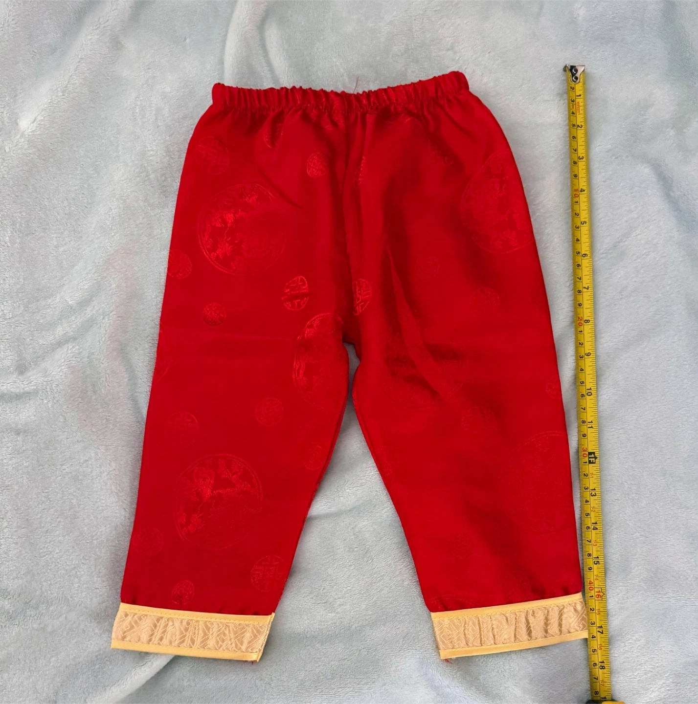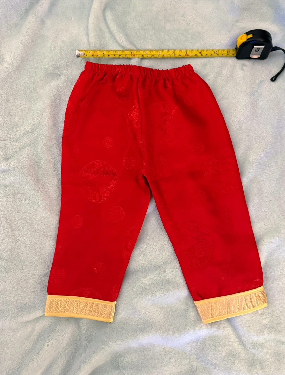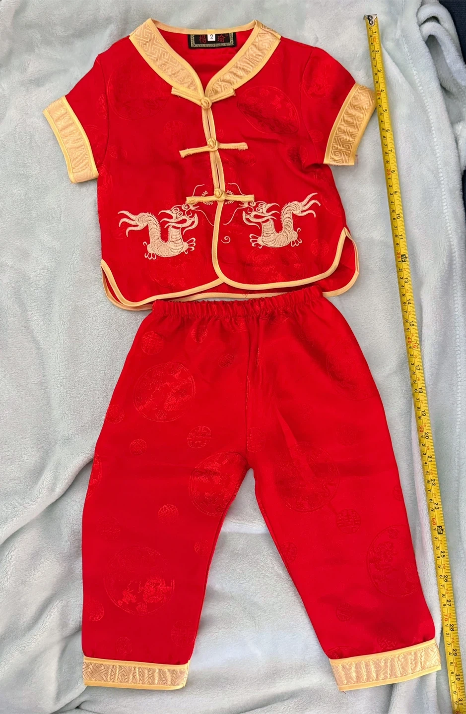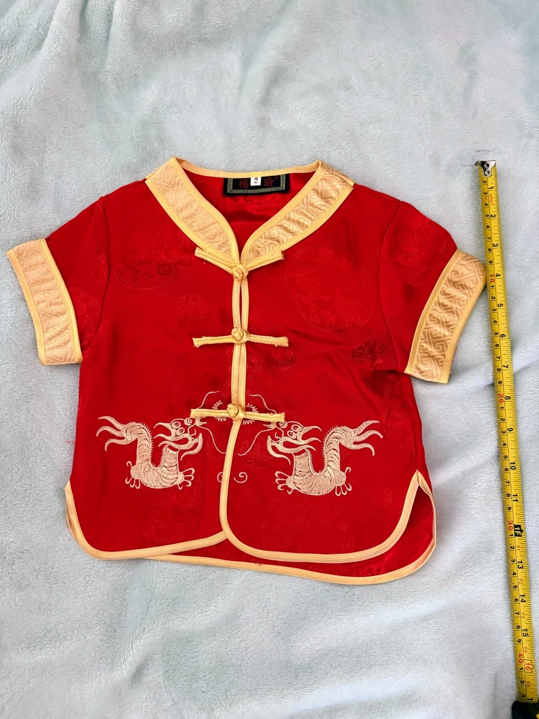 Red short sleeve traditional Chinese top with gold trim and dragon embroidery. Features frog button closures. Size 2.