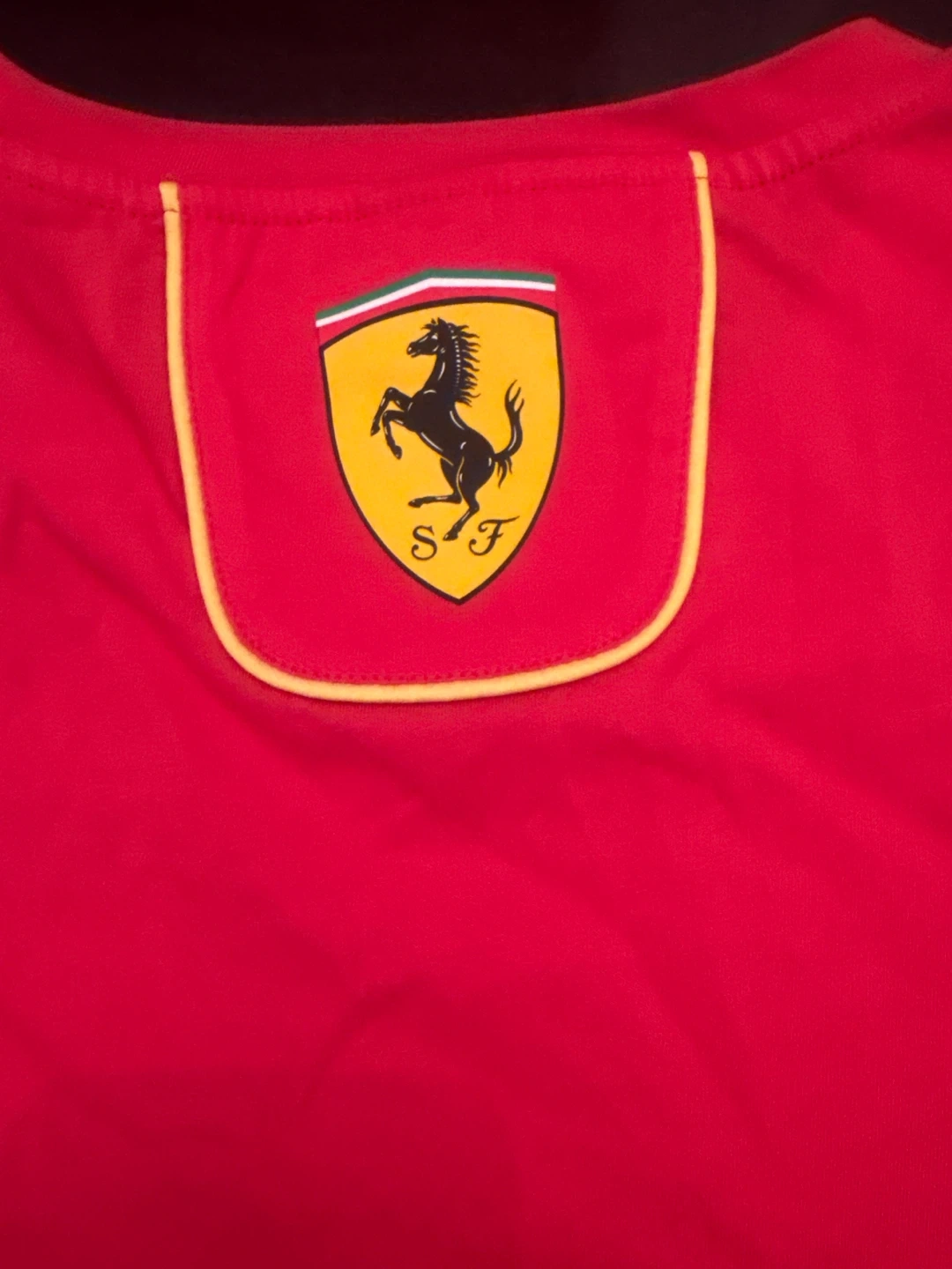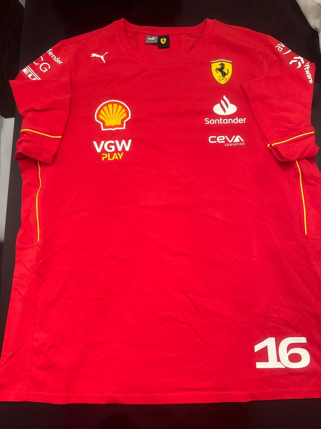 This is a red Puma t-shirt for Scuderia Ferrari. It features sponsor logos from Shell, Santander, Ceva Logistics, and VGW Play. The shirt has yellow trim details on the sleeves and sides. It's a fun piece for any motorsport fan!