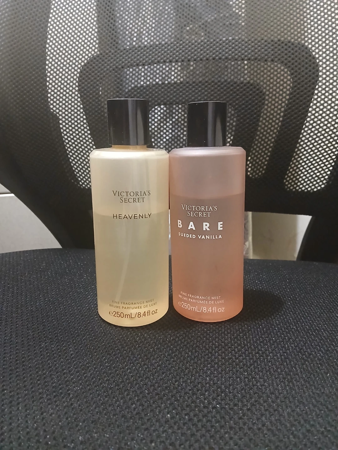 Two Victoria's Secret fine fragrance mists included. One is Heavenly, and the other is Bare Sueded Vanilla. Each bottle is 250mL or 8.4 fl oz. Used