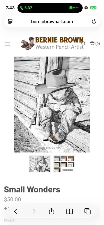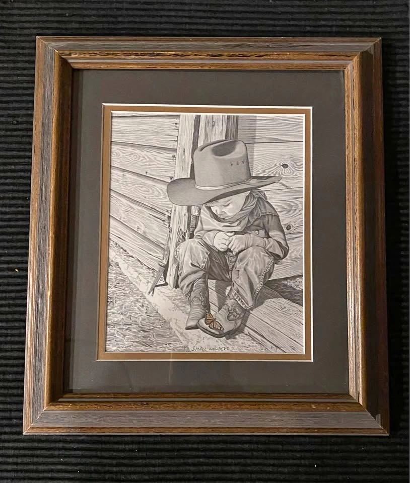 Charming Bernie Brown "Small Wonders" framed pencil drawing. Features a sweet little cowboy kid in a hat and boots, with a monarch butterfly on his boot. Rustic wood frame with matting. Looks great, ready to hang. Pick up Haysboro SW.