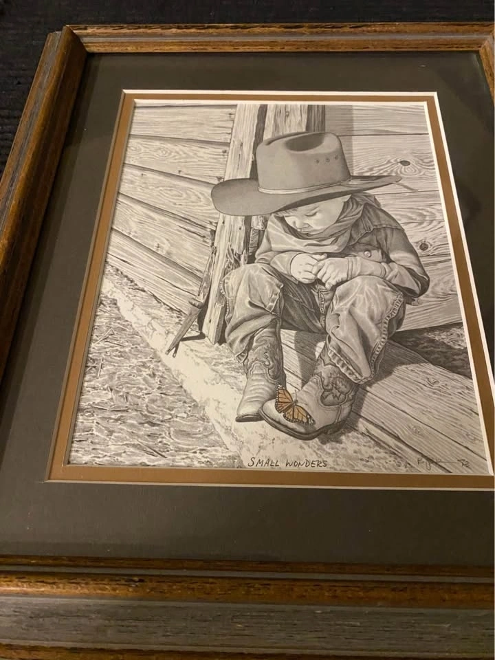Charming Bernie Brown "Small Wonders" framed pencil drawing. Features a sweet little cowboy kid in a hat and boots, with a monarch butterfly on his boot. Rustic wood frame with matting. Looks great, ready to hang. Pick up Haysboro SW.