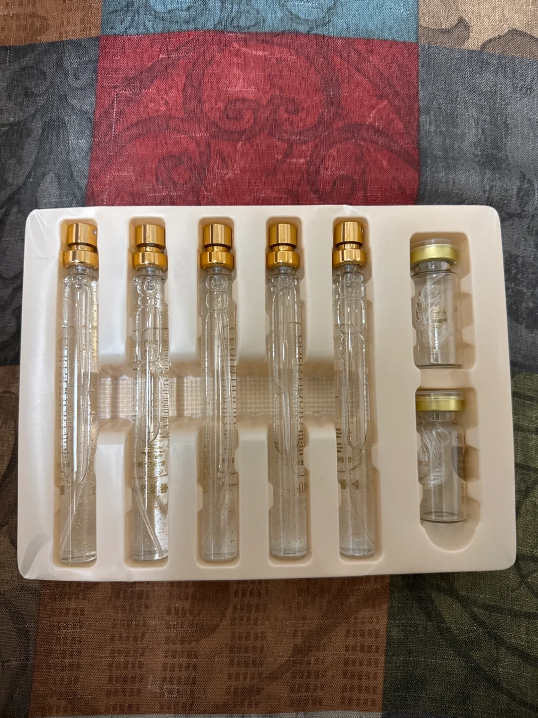 This set includes 5 vials and 2 smaller bottles for skincare. It features ingredients like iris pallida extract and centaurea cyanus flower extract. The expiry date is February 4, 2028.