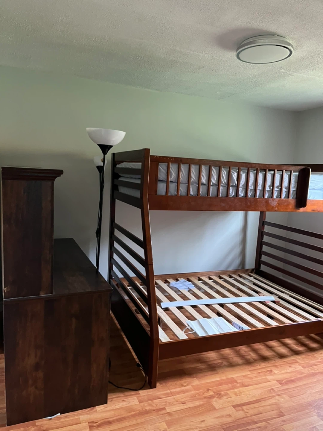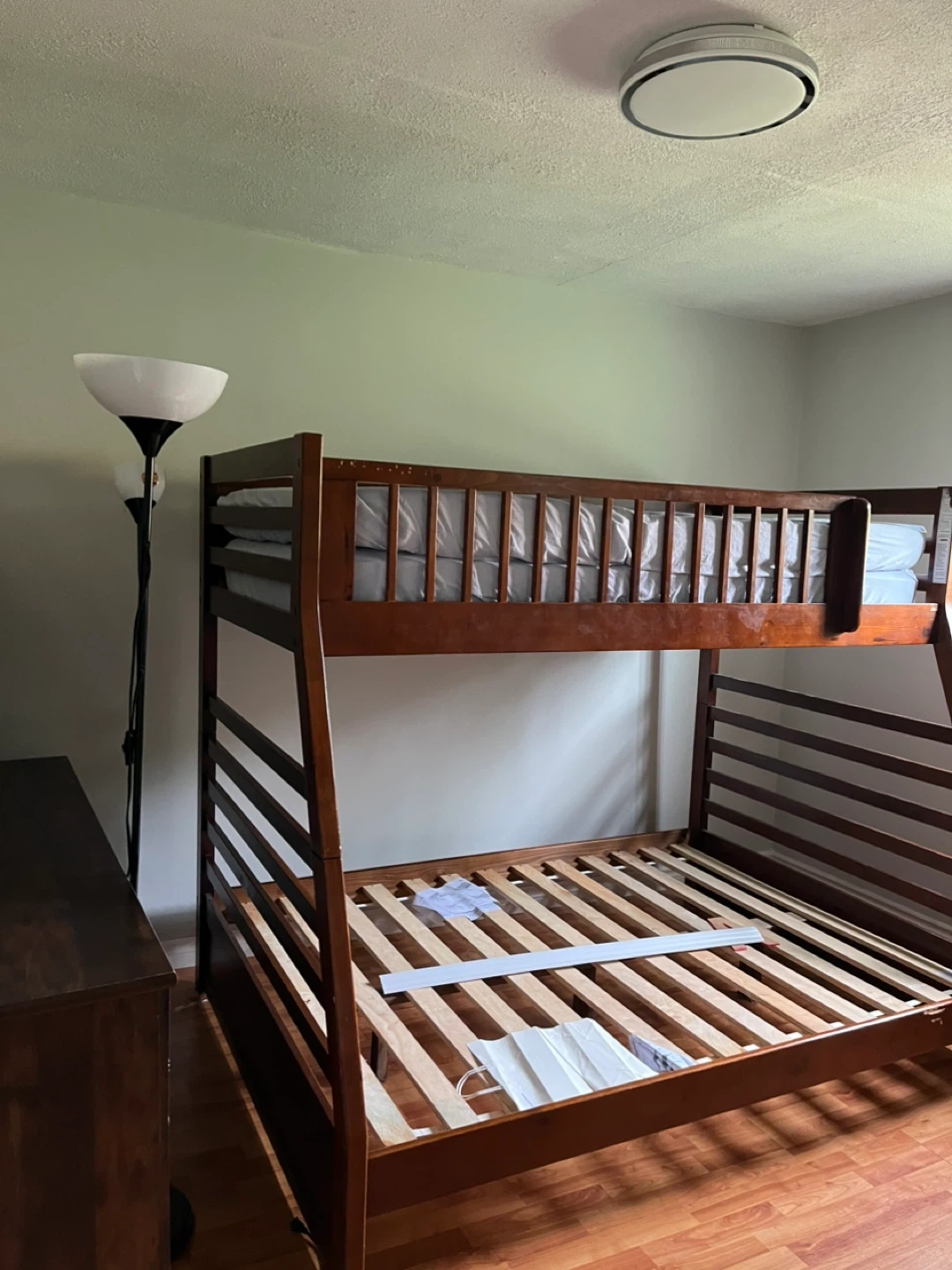 Solid wood bunk bed with a warm wood finish. It's a twin over double configuration. This bed frame is built for durability and would be great for a kids' room or guest space!
