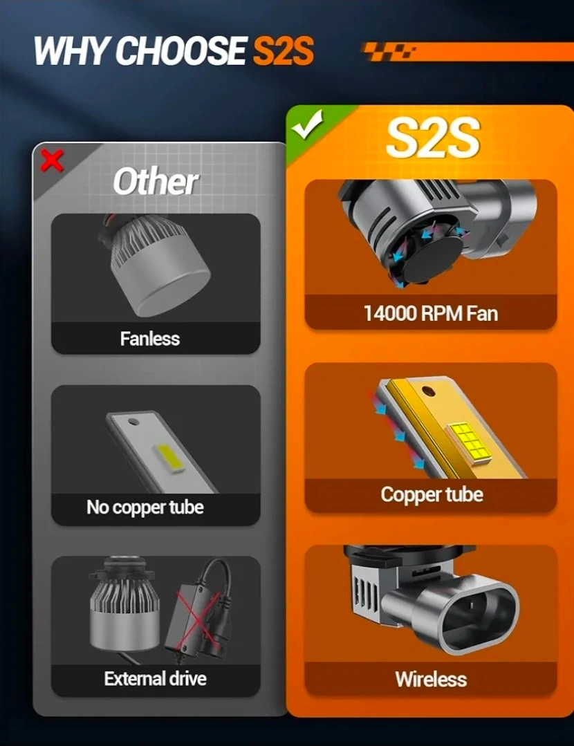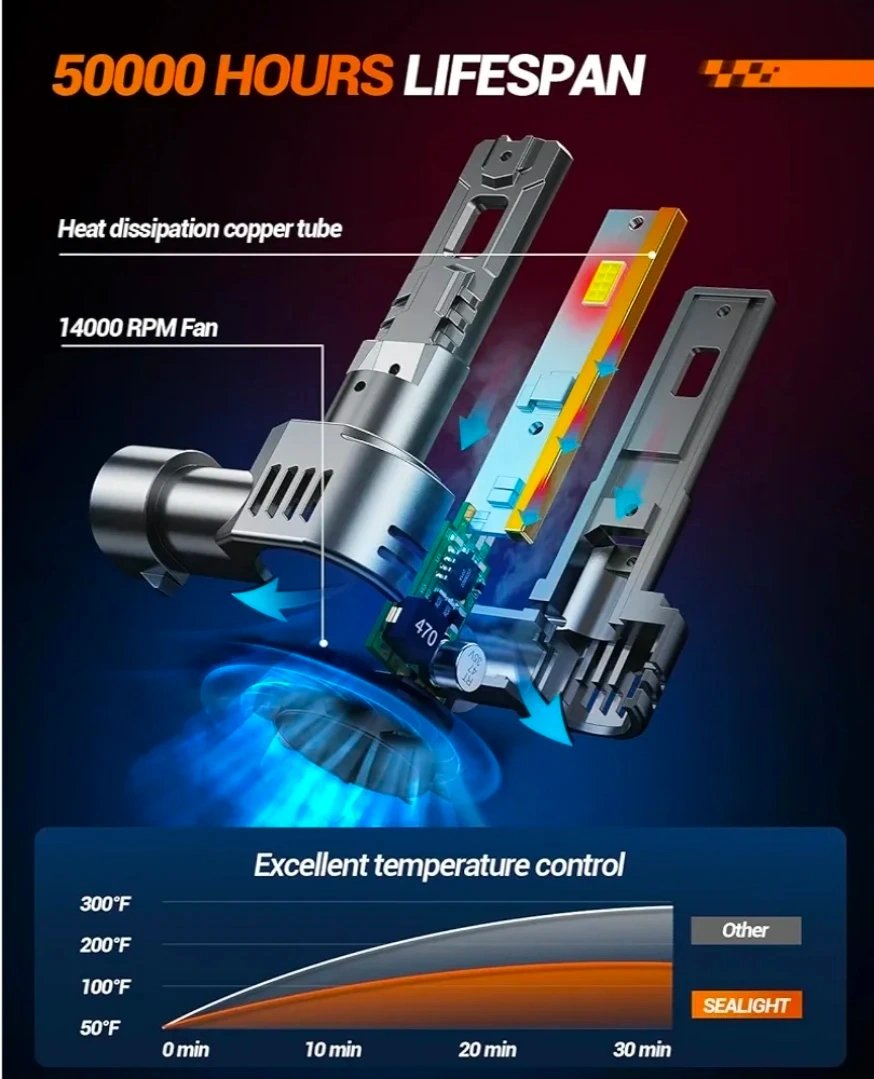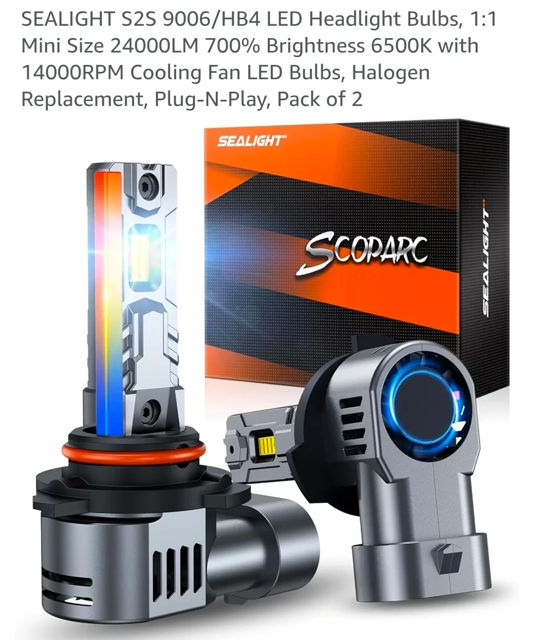 These SEALIGHT S2S LED headlight bulbs offer 24000LM brightness with a 6500K color temperature. They feature a 14000RPM cooling fan, copper tube heat dissipation, and a wireless plug-and-play design. They're a halogen replacement. The lifespan is rated at 50,000 hours.