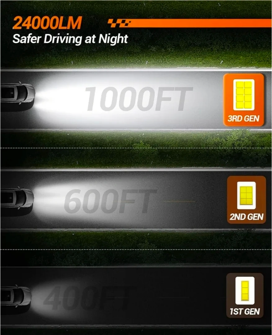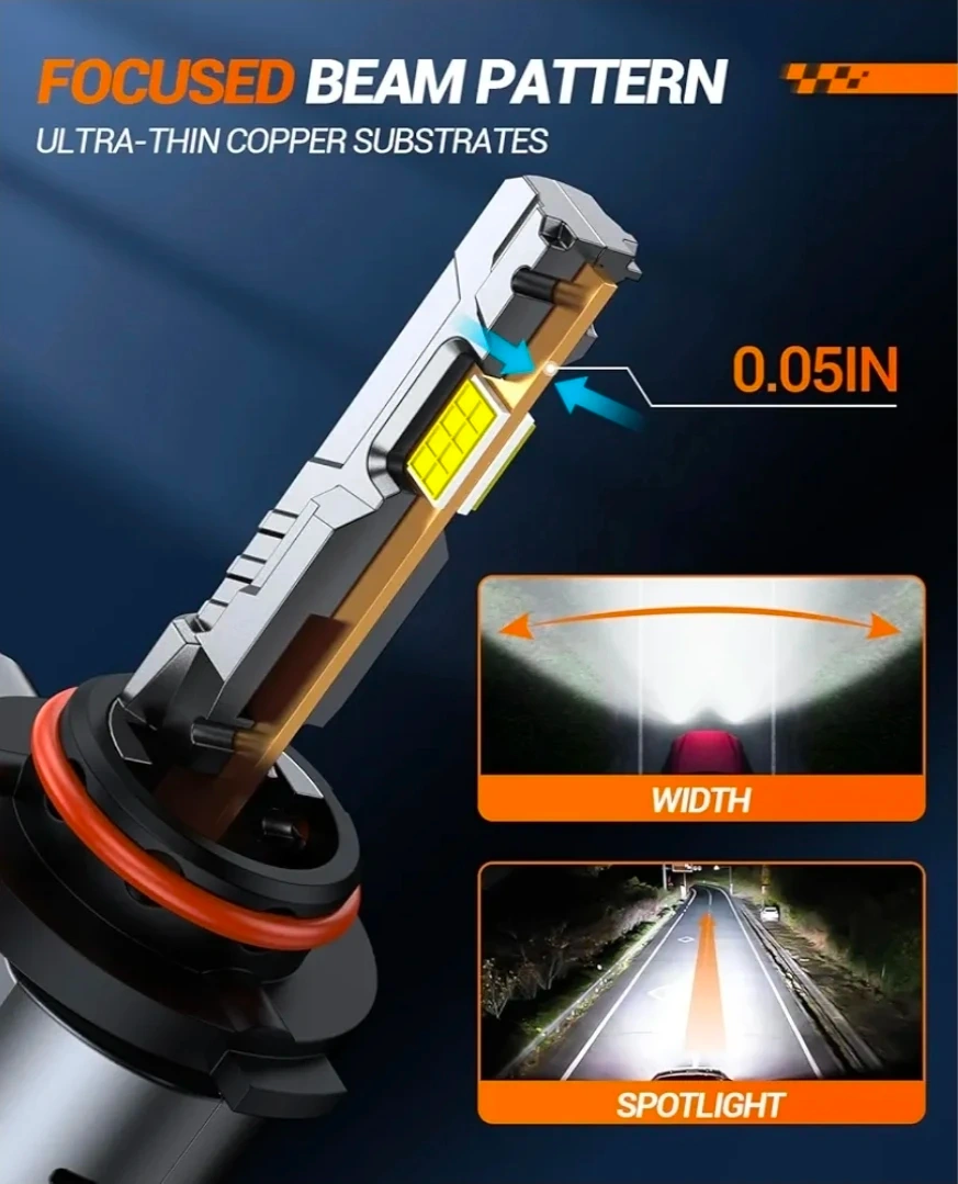 These SEALIGHT S2S LED headlight bulbs offer 24000LM brightness with a 6500K color temperature. They feature a 14000RPM cooling fan, copper tube heat dissipation, and a wireless plug-and-play design. They're a halogen replacement. The lifespan is rated at 50,000 hours.
