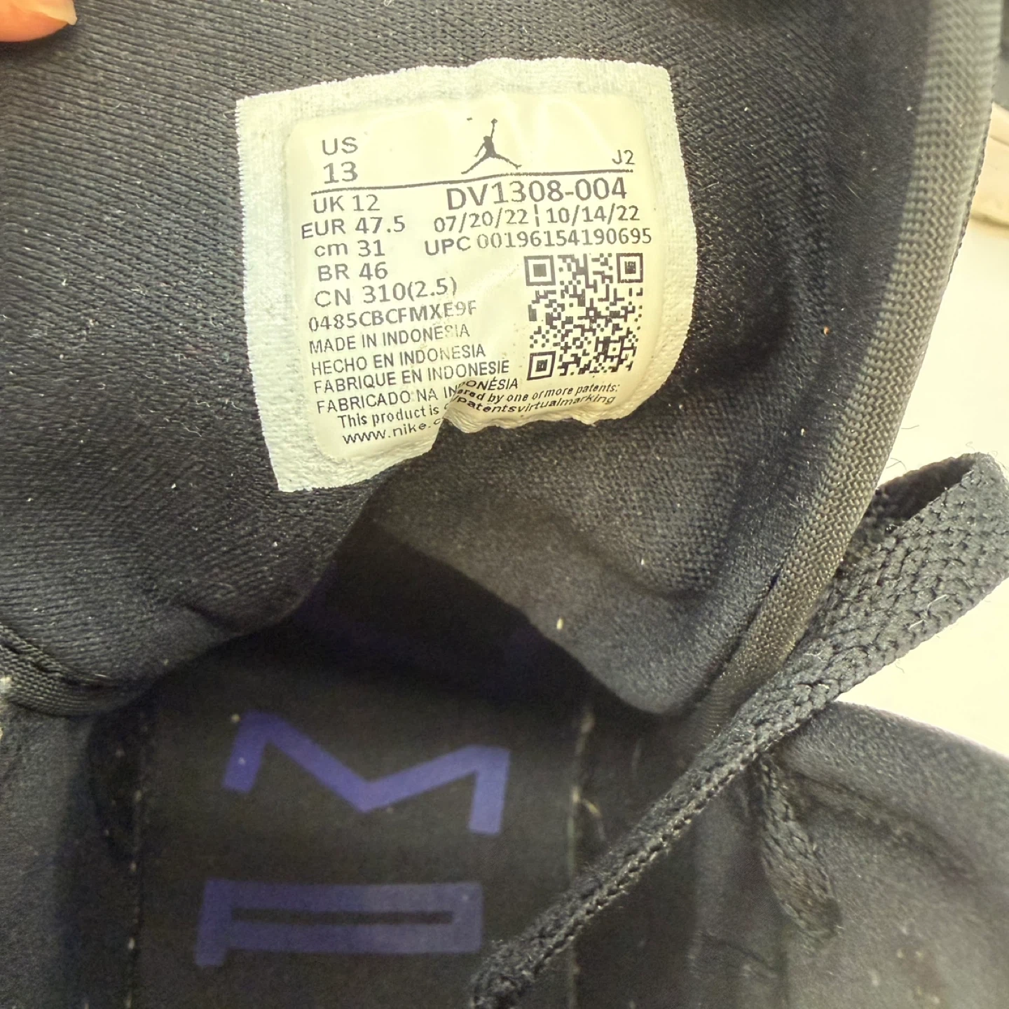 Men’s Air Jordan 1 Mid sneakers in all-black colorway with purple Jumpman logo on tongue.