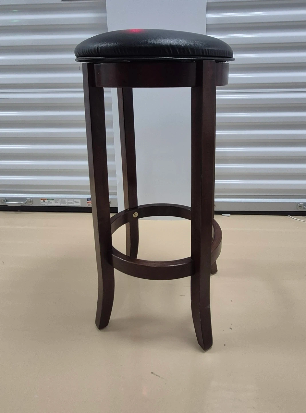 2x dark wood bar stools with a black faux leather seat. It features a circular footrest for added stability. This stool would be a nice addition to a home bar or kitchen island.