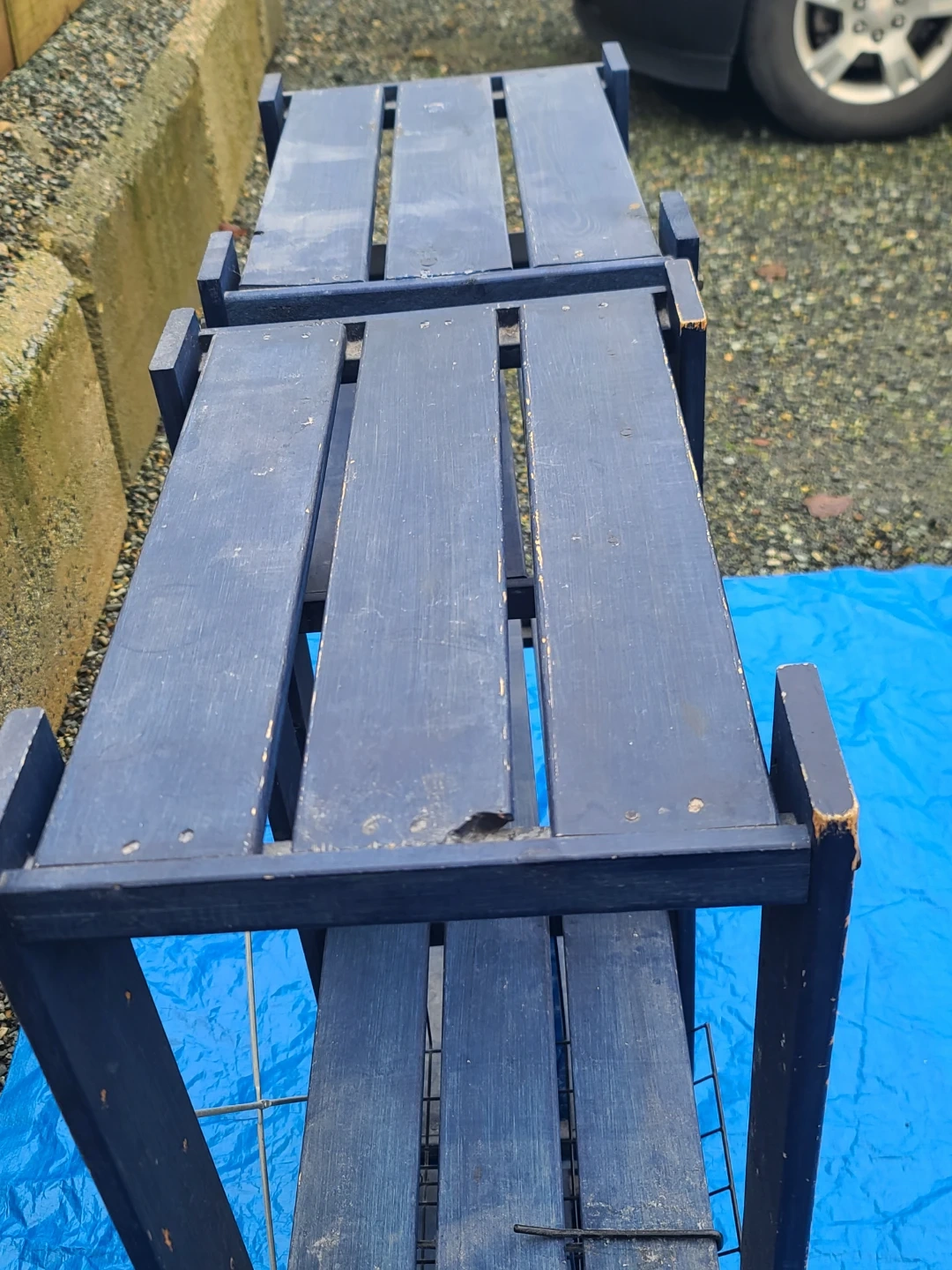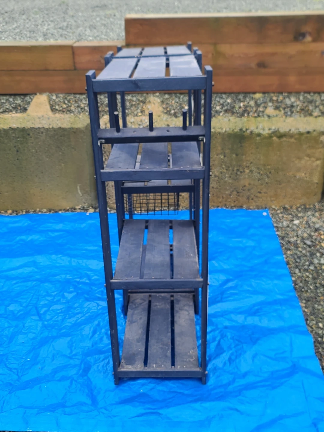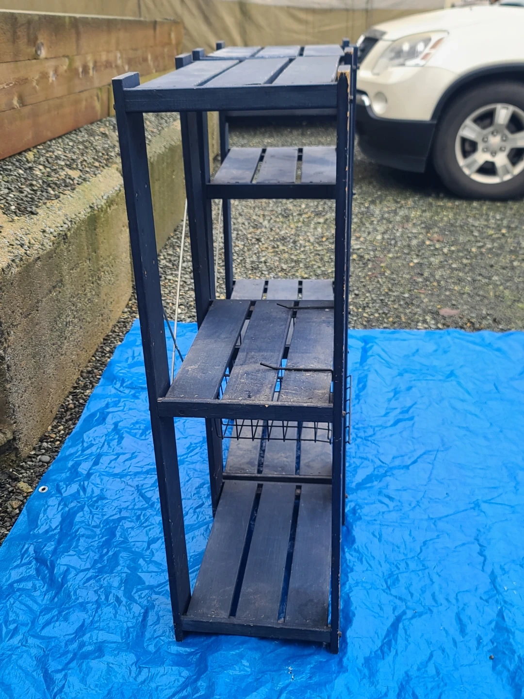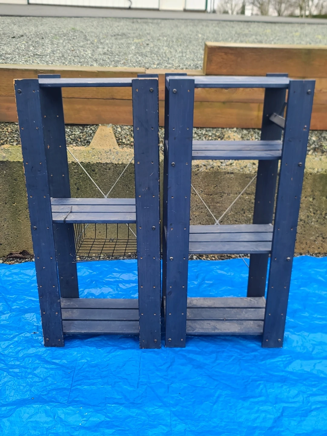 Sturdy dark blue wooden shelving units. Has multiple shelves for storage. One unit has a wire basket attached. Great for organizing garage, shed, or outdoor space. Measurements to follow. Delivery can be arranged. Viewing and pickup by appointment