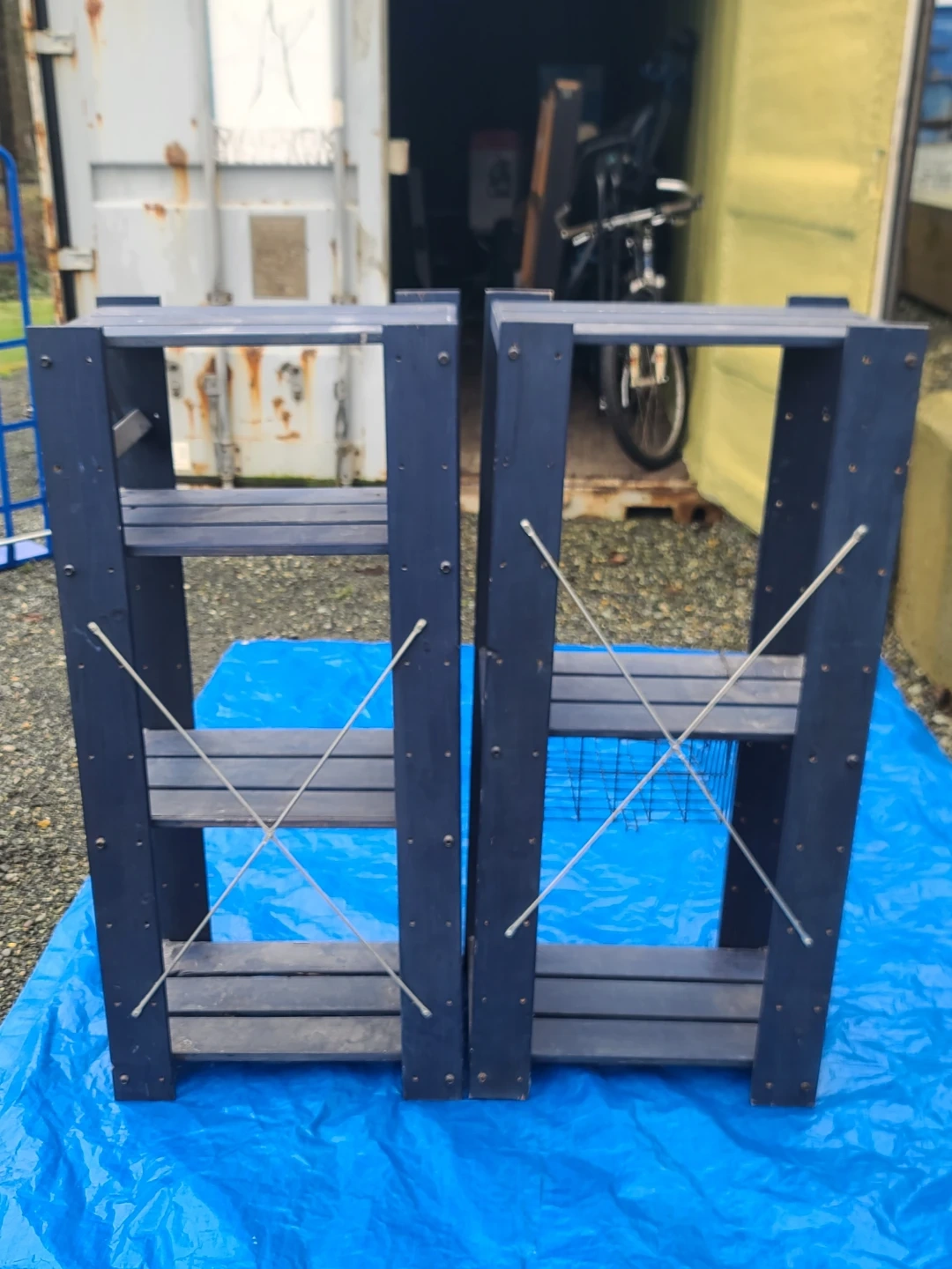 Sturdy dark blue wooden shelving units. Has multiple shelves for storage. One unit has a wire basket attached. Great for organizing garage, shed, or outdoor space. Measurements to follow. Delivery can be arranged. Viewing and pickup by appointment