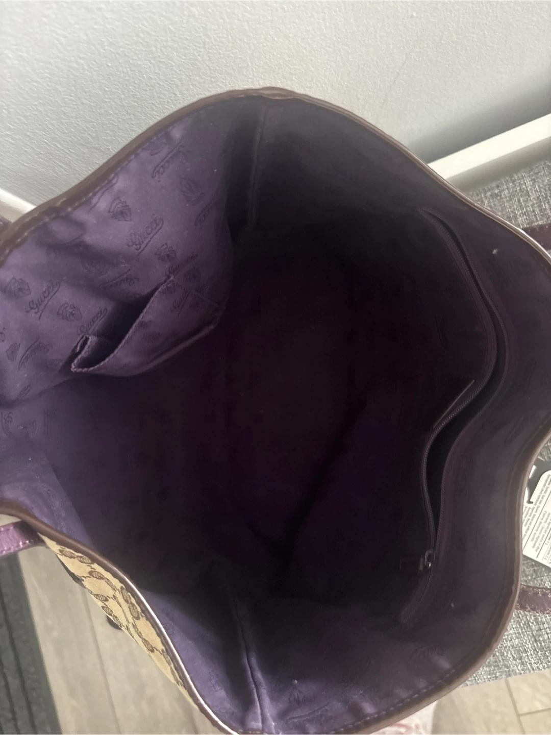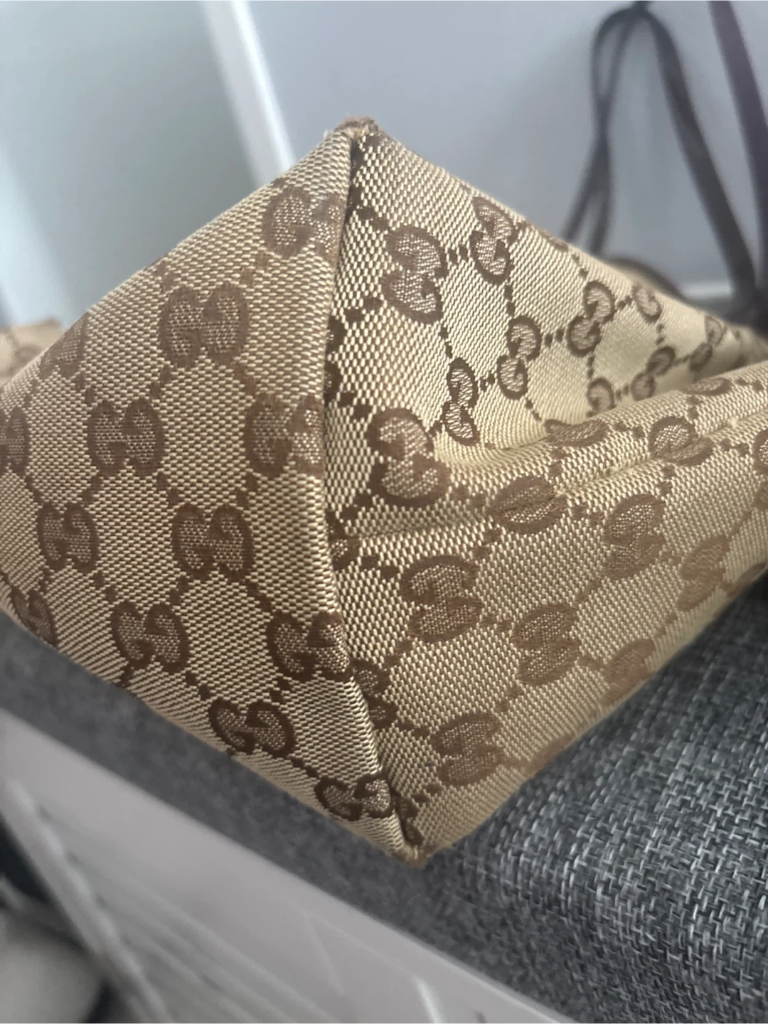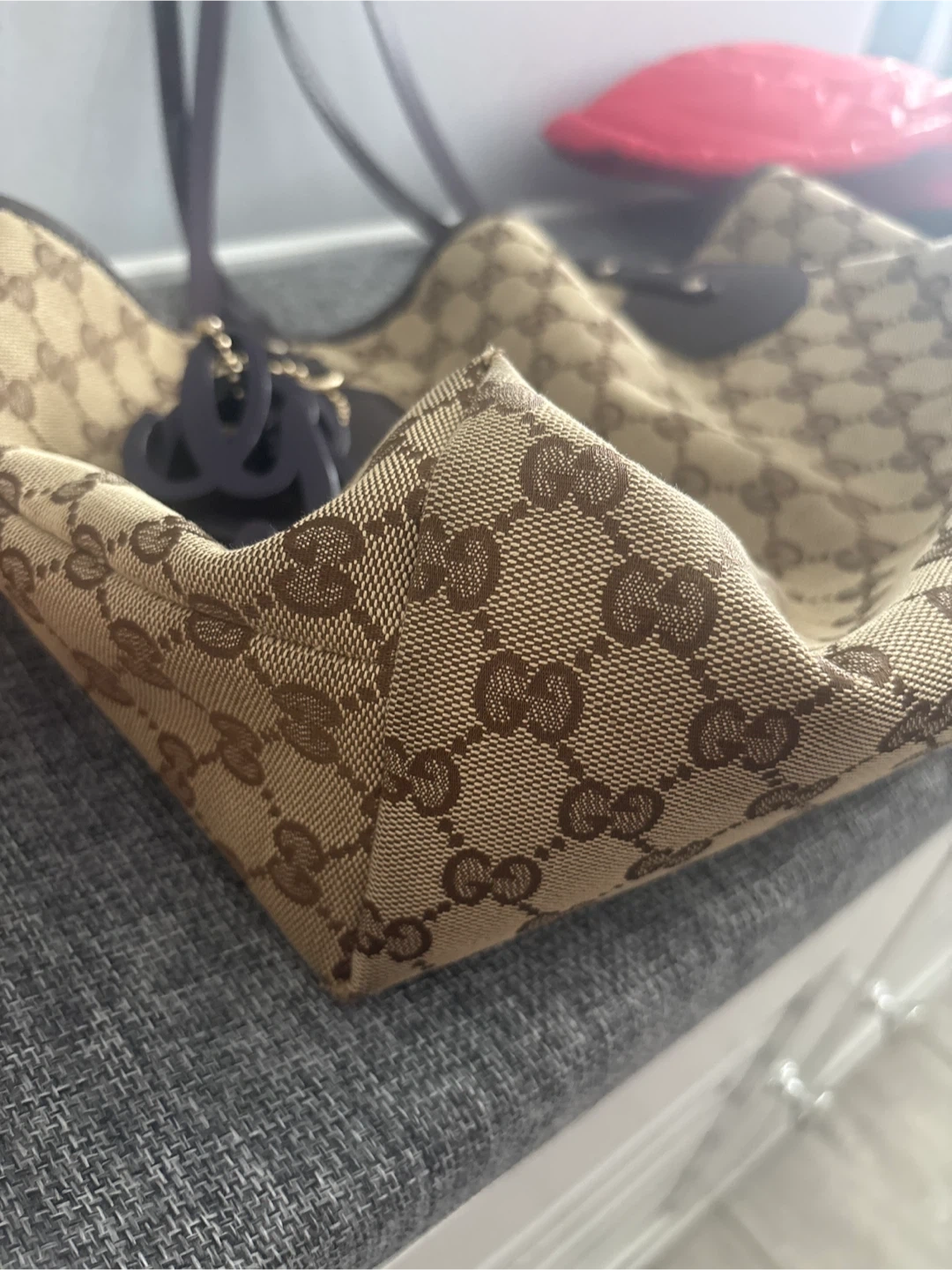 Classic Gucci GG monogram canvas tote bag with leather trim. It features double shoulder straps. This bag is perfect for everyday use, carrying your essentials in style.