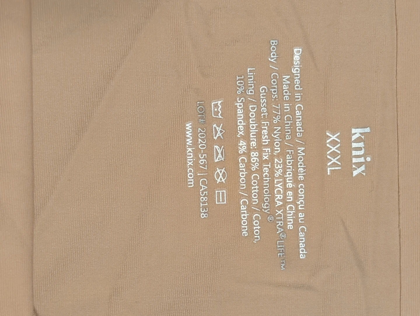 These Knix seamless briefs are made in Canada. They feature a body made of 77% Nylon and 23% LYCRA XTRA LIFE™ fabric. The lining is 86% Cotton and 10% Spandex, with a 4% Carbon gusset. These are a size XXXL. Bought Mom 3 pairs. She wore one, didn't like them, so that one went in garbage and 2 into dresser drawer. She went back to Depends. These are for incontinence I believe. Not sure how much they hold, but I bet Google does. These 2 have never been worn. I think they were $30ish a pair, so $10 each seems fair.
