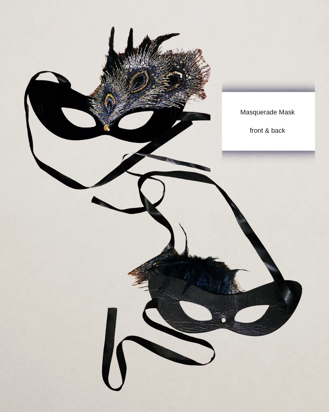 Masquerade mask with black ribbon ties. Features decorative peacock feathers and gold sequins. Suitable for parties or events!