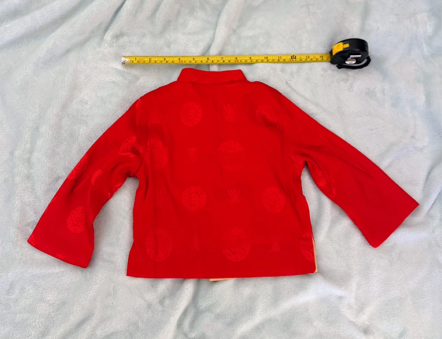 This is a reversible child's jacket. One side is yellow with red trim and frog closures. The other side is red with yellow trim and frog closures. It features traditional Chinese patterns and is made of silk.