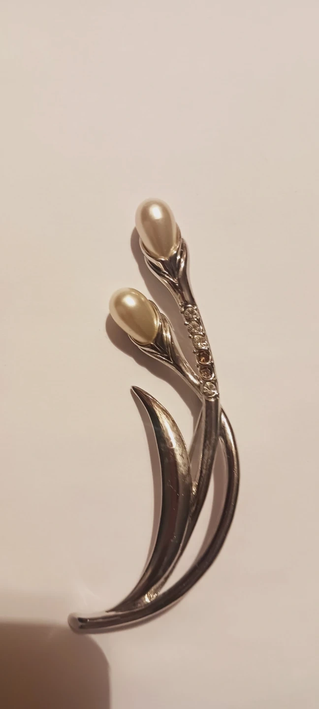 This beautiful brooch features a silver-tone metal design with two pearl accents and sparkling rhinestone details, shaped like a stylized flower with leaves. It's a lovely accessory for any outfit!!! 3.5"×1". Excellent condition, like new. ALL MY PRICES ARE NEGOTIABLE !!