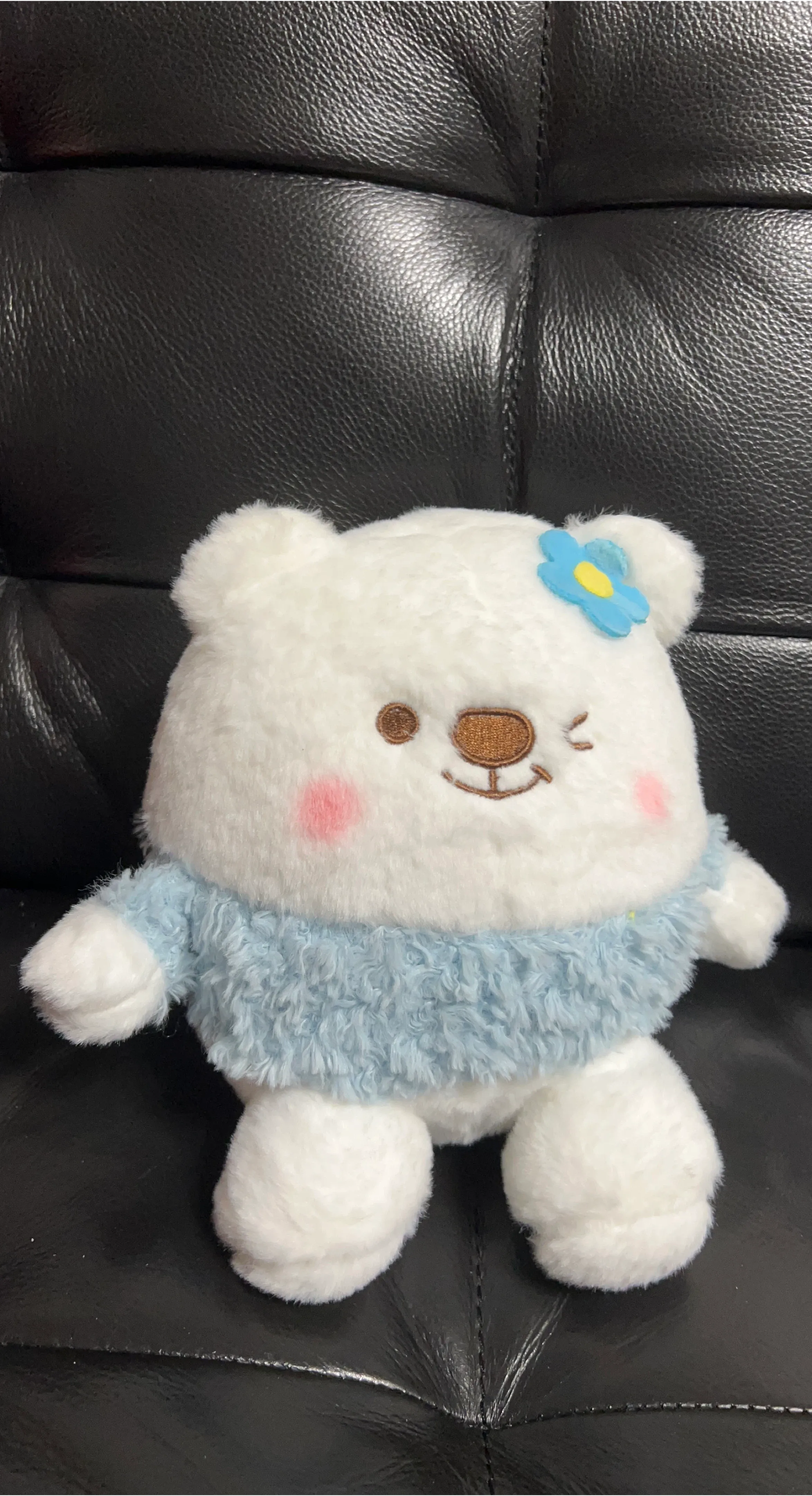 This is a super soft plush white bear. It's wearing a cute blue furry sweater and has a little blue flower accessory on its head. Its cheeks are rosy pink!