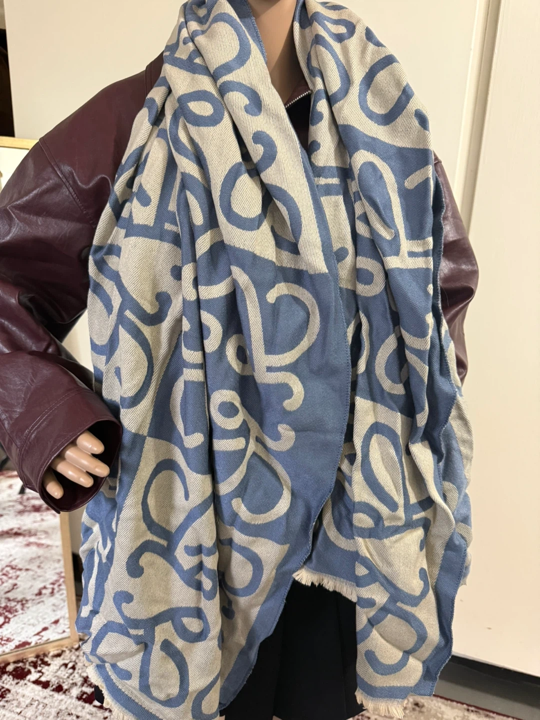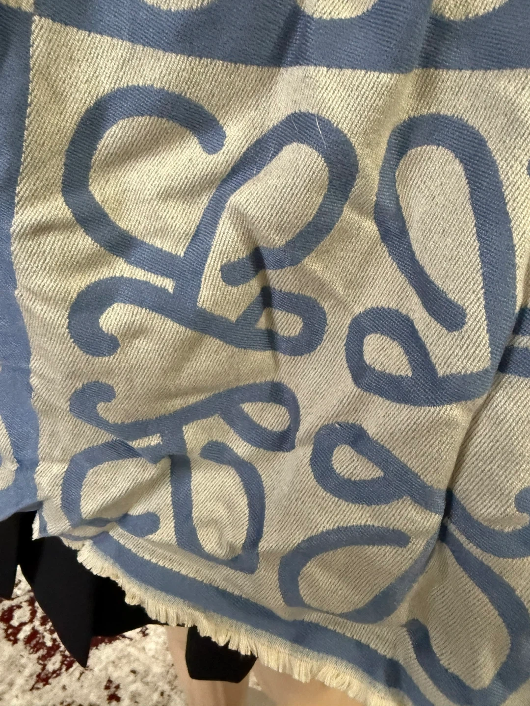A stylish blue and cream patterned scarf. It features a repeating abstract logo design. The material appears to be a soft woven fabric with fringed edges. It's a versatile accessory for cooler weather!