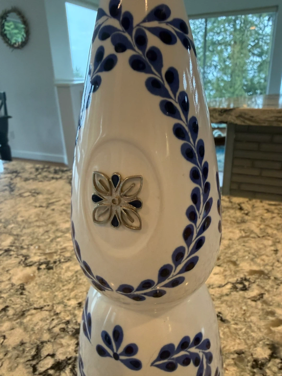 Decorative Clase Azul ceramic bottle with blue floral accents. It features a metal stopper with the Clase Azul logo. This bottle's design makes it a nice display piece for home decor.