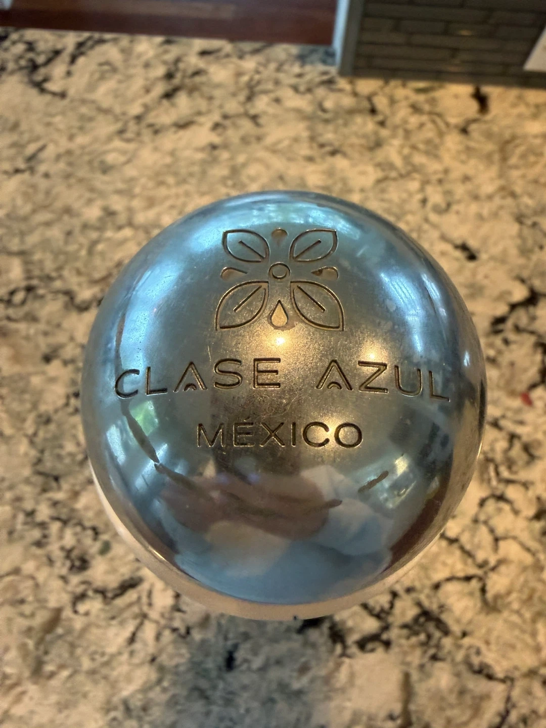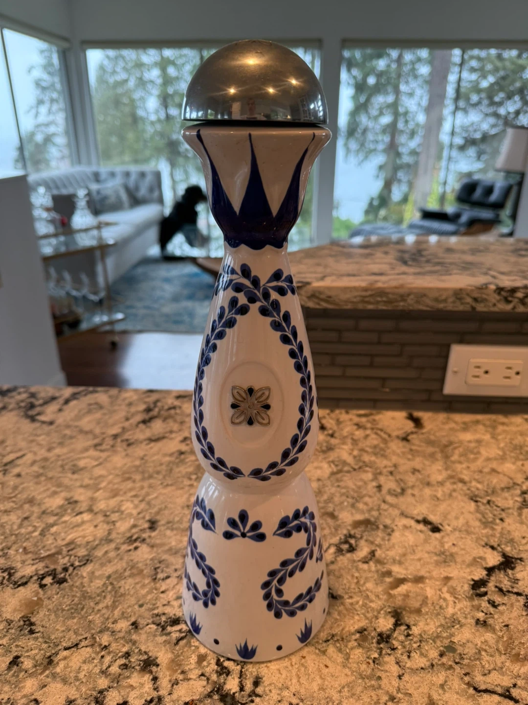 Decorative Clase Azul ceramic bottle with blue floral accents. It features a metal stopper with the Clase Azul logo. This bottle's design makes it a nice display piece for home decor.