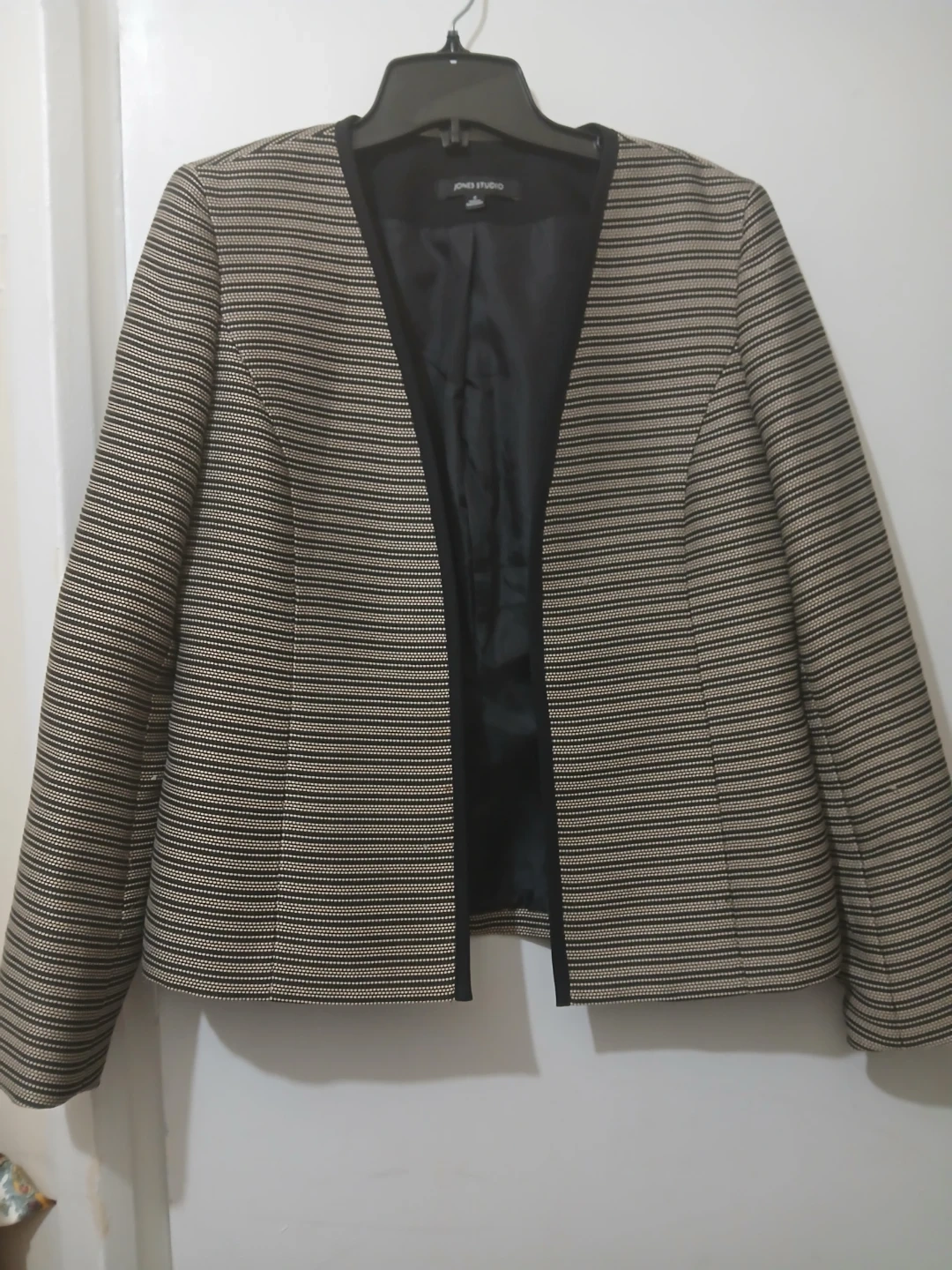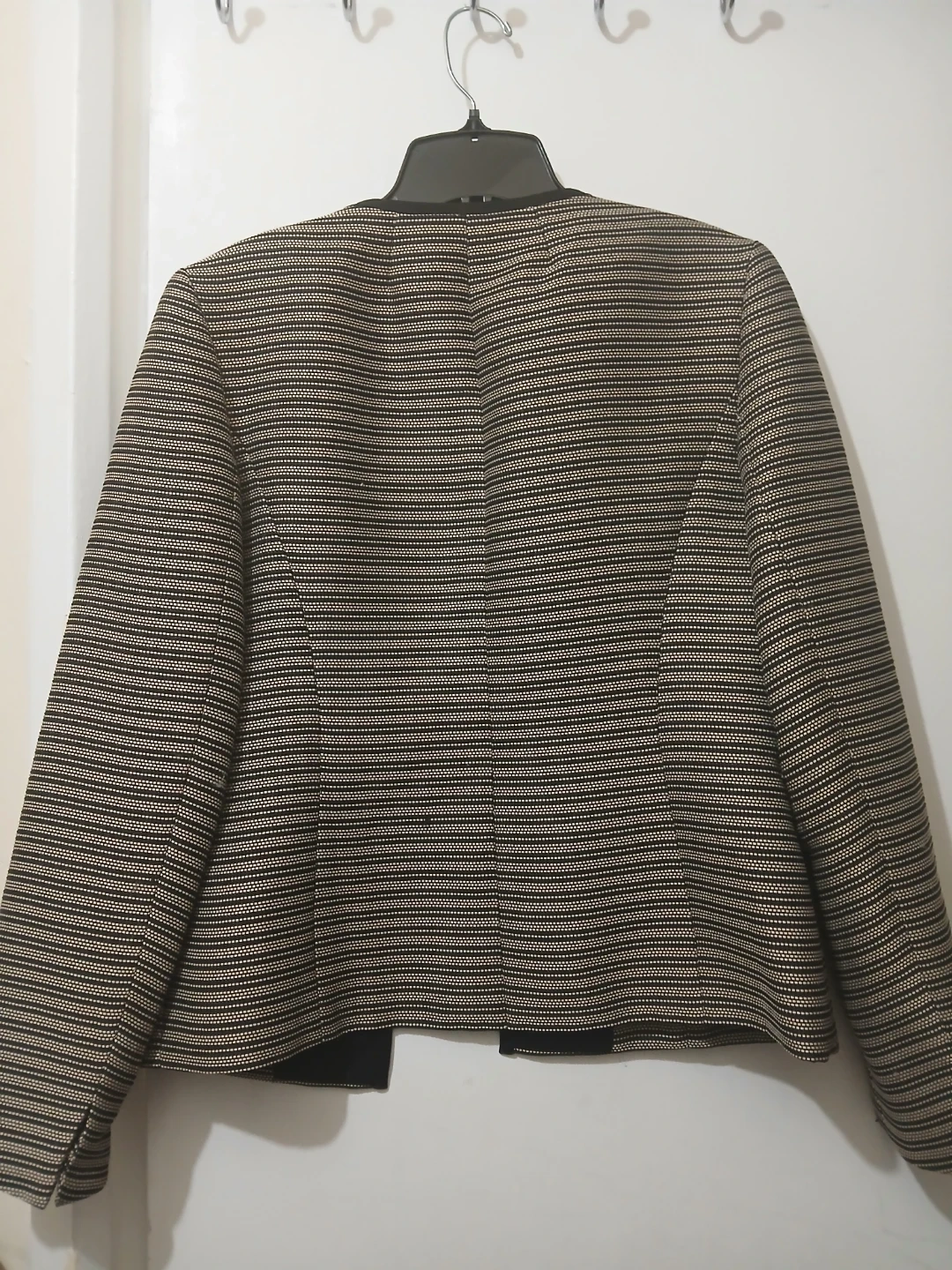 A chic Pia Studio blazer in a classic striped pattern. It's fully lined with a sleek black interior. This jacket features an open-front design.
