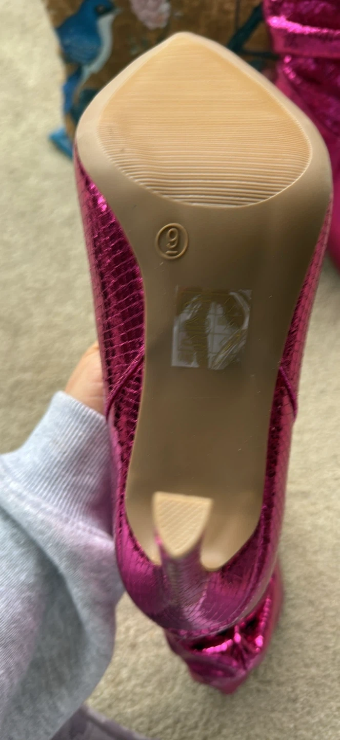 These stylish heeled booties feature a vibrant pink metallic finish with a snake print texture. They have a pointed toe and a comfortable slouchy shaft. Size 9.